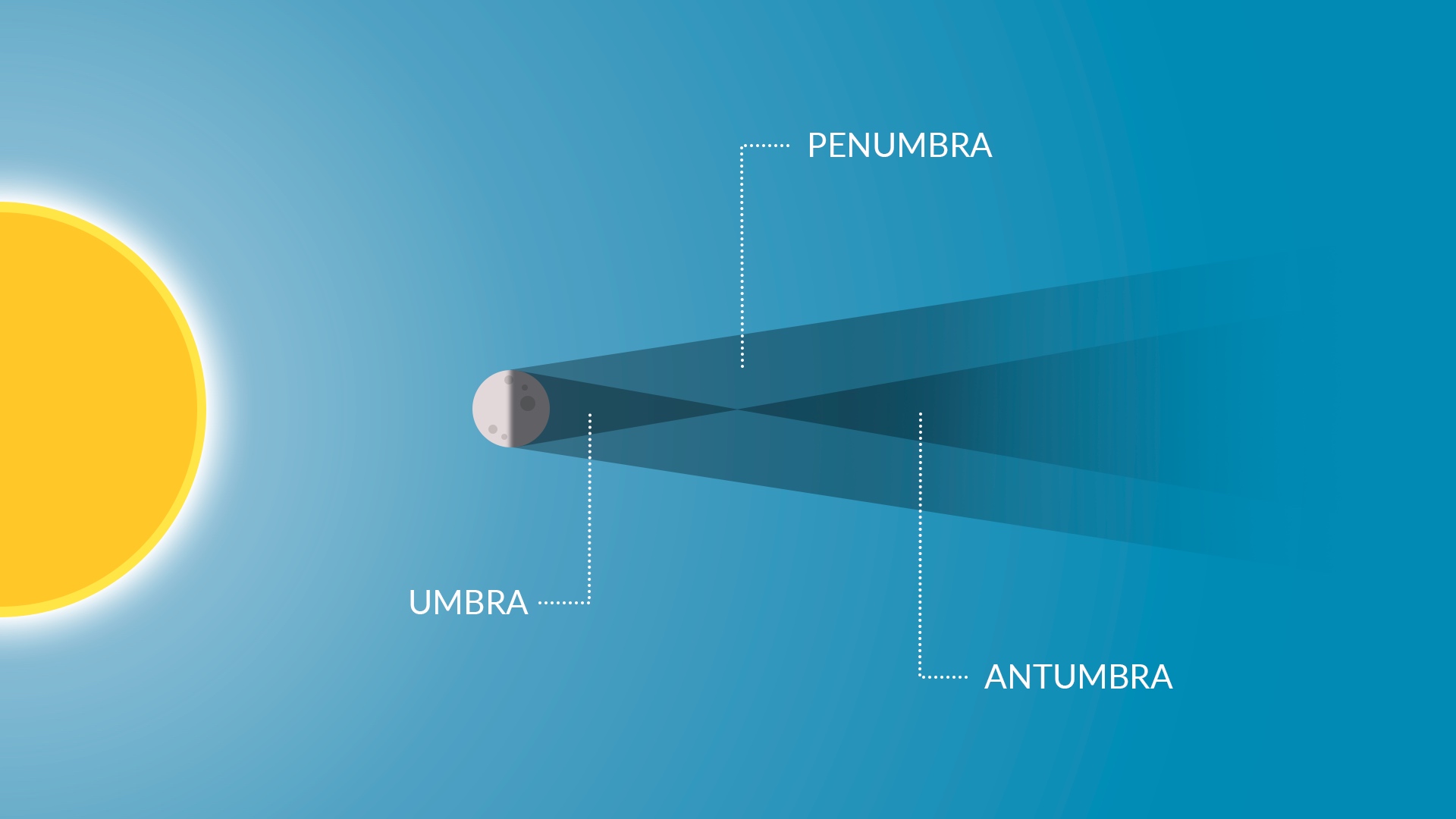 La sombra de la Luna se puede dividir en tres partes: una penumbra, una umbra y una antumbra. El tipo de eclipse que vemos depende de qué parte de la sombra caiga sobre la Tierra.