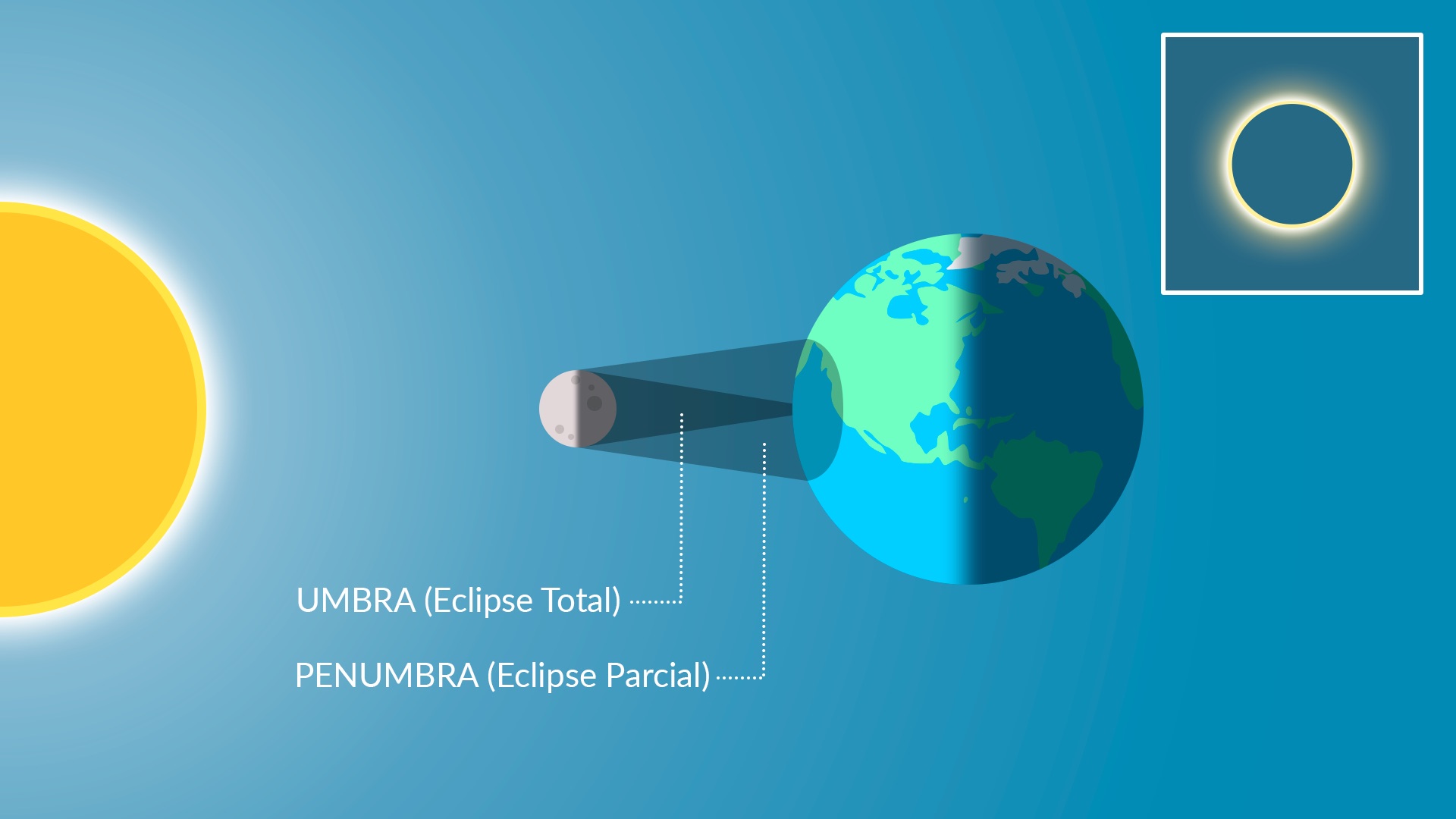 Un eclipse solar ocurre cuando la Luna pasa entre el Sol y la Tierra, bloqueando toda o parte de la luz del Sol. Los eclipses solares solo pueden ocurrir durante una fase de Luna Nueva cuando la Luna está posicionada entre el Sol y la Tierra.