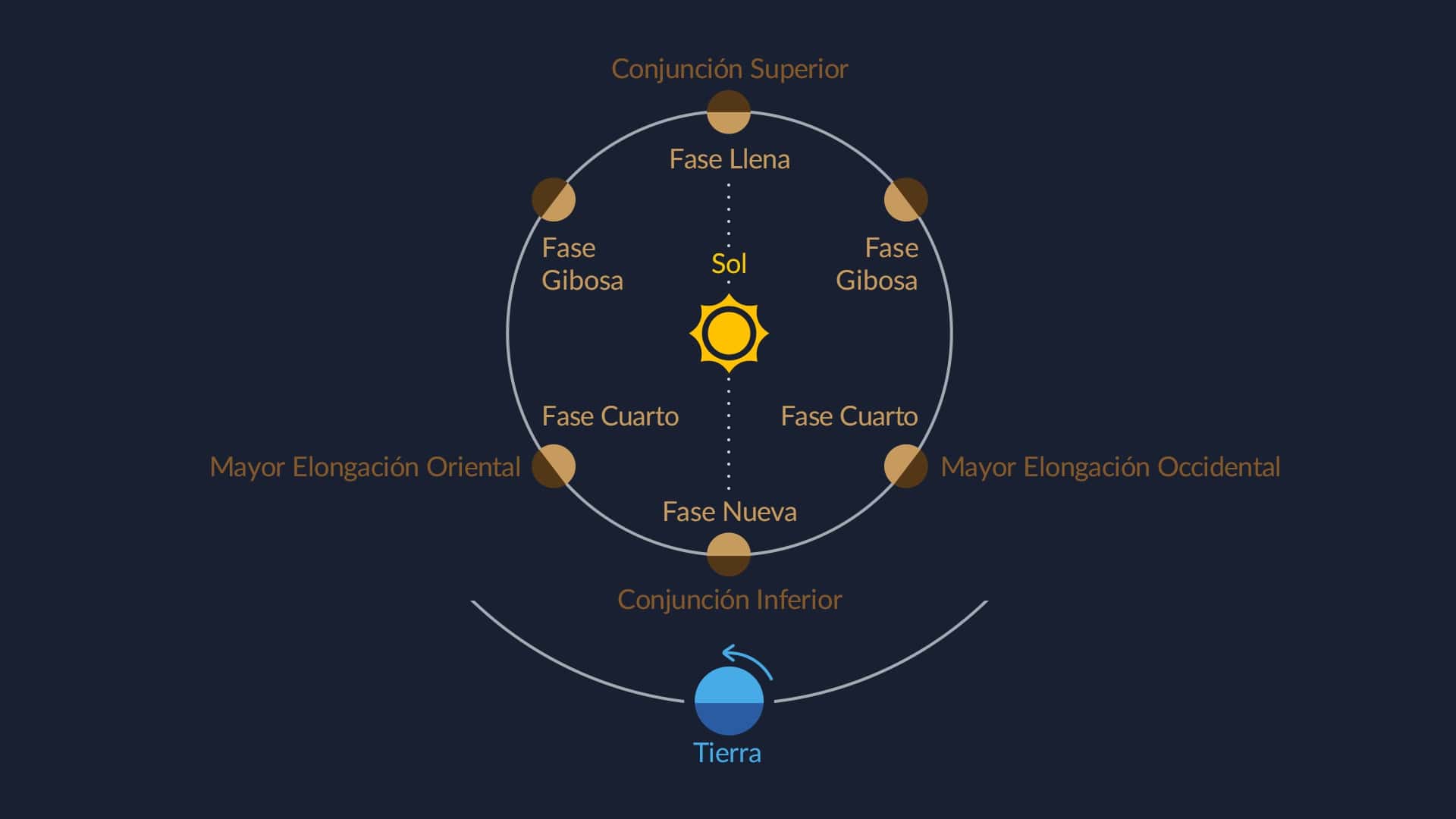 Como se muestra en la imagen de arriba, los planetas inferiores pasan por un ciclo completo de fases: desde la fase nueva en la conjunción inferior hasta las fases de cuarto cerca de las máximas elongaciones y la fase llena en la conjunción superior. Sin embargo, observar las fases llena y nueva es extremadamente difícil, porque durante ellas los planetas se pierden en el resplandor del Sol. Por eso, las fases visibles van de creciente a gibosa.
