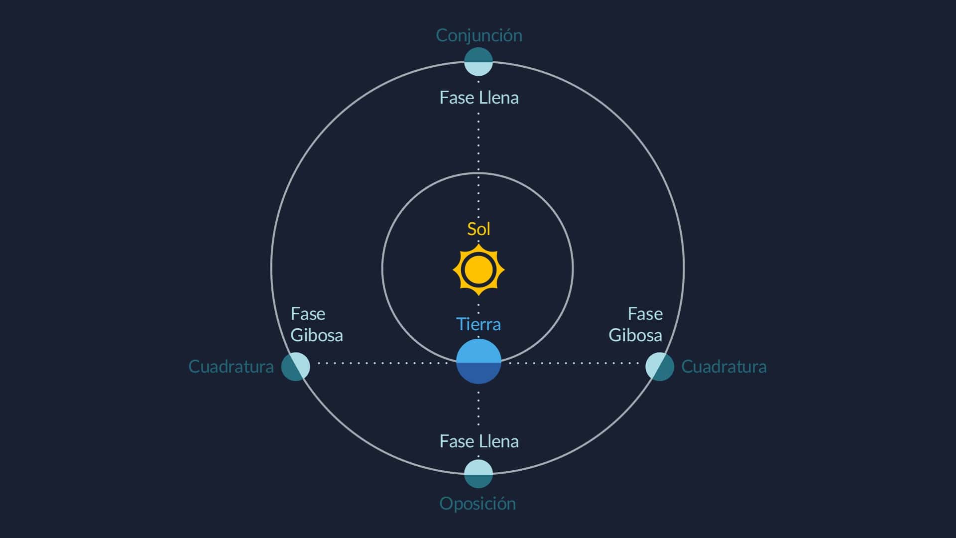 Como el Sol es el objeto más brillante del cielo, puede ocultar cualquier otra estrella o planeta. Si conoces la posición del Sol, puedes elegir el mejor momento para observar (cuando el objeto que quieres ver está lo más lejos posible del Sol). Veamos qué es la elongación tomando como ejemplo los planetas del Sistema Solar.