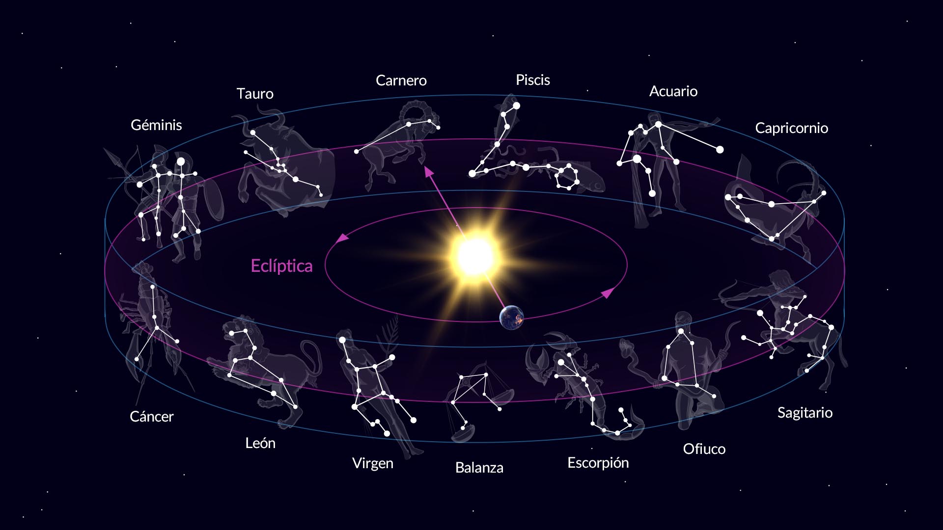 Las constelaciones zodiacales son las doce constelaciones que tradicionalmente forman parte del zodiaco y que se corresponden aproximadamente con los signos zodiacales. Las constelaciones eclípticas son todas las constelaciones que se encuentran a lo largo del plano de la eclíptica, la trayectoria aparente del Sol en el cielo a lo largo del año. Este grupo incluye las doce constelaciones zodiacales y también a Ofiuco, que pertenece a la familia de Hércules y no al zodiaco. Si aún no tienes clara la diferencia entre signos del zodiaco, constelaciones zodiacales y constelaciones eclípticas, consulta nuestra infografía del zodiaco para obtener una explicación visual y sencilla.