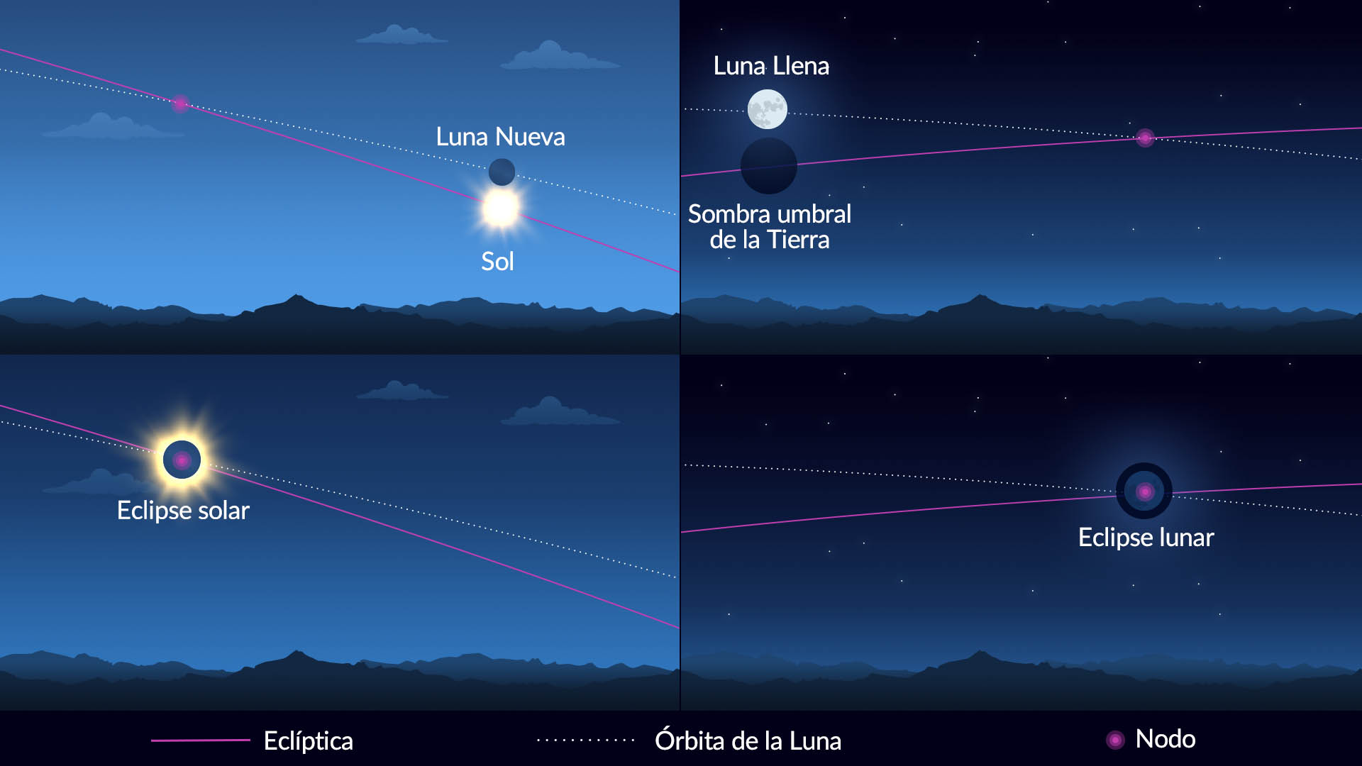 La órbita de la Luna de la Tierra se inclina 5.1° desde el plano de la eclíptica. La órbita de la Luna cruza el plano de la eclíptica en dos puntos: el nodo ascendente (después del cual la Luna se eleva ligeramente por encima de la eclíptica) y el nodo descendente (después del cual la Luna se hunde por debajo de la eclíptica). Si la Luna llena coincide con el momento en que la Luna cruza la eclíptica, experimentamos un eclipse lunar; si ocurre durante la Luna nueva, experimentamos un eclipse solar. La Luna cruza la eclíptica unas dos veces al mes, pero no siempre durante las fases de Luna nueva o Luna llena, por lo que no experimentamos eclipses cada vez.