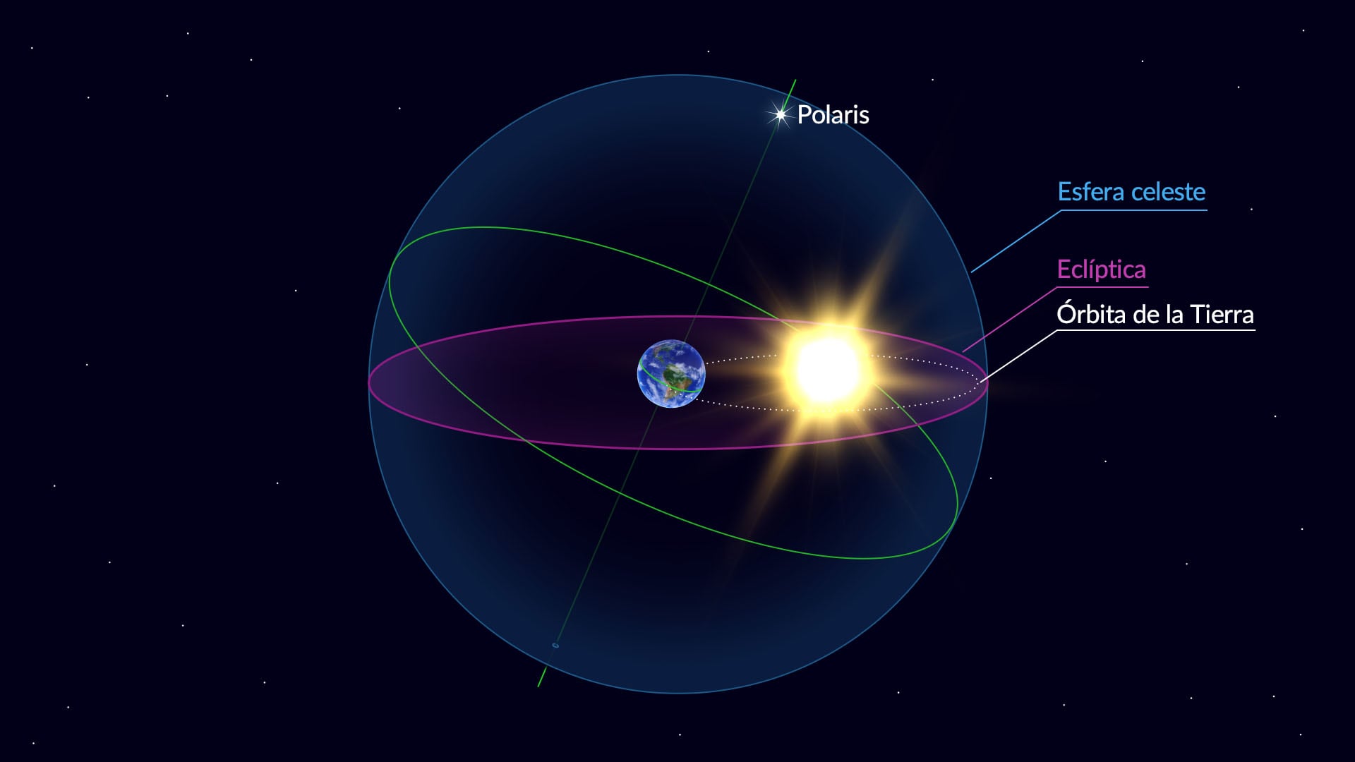 El plano orbital de la Tierra intersecta la esfera celestial - una esfera imaginaria centrada en la Tierra, que representa la apariencia del cielo desde nuestro planeta. La esfera celestial es como un globo con estrellas, planetas y otros objetos celestes dibujados en él. Y la eclíptica es el círculo en el que el plano orbital de la Tierra cruza la esfera celestial. A su vez, el plano que contiene la eclíptica se llama plano de la eclíptica - coincide con el plano orbital de la Tierra.