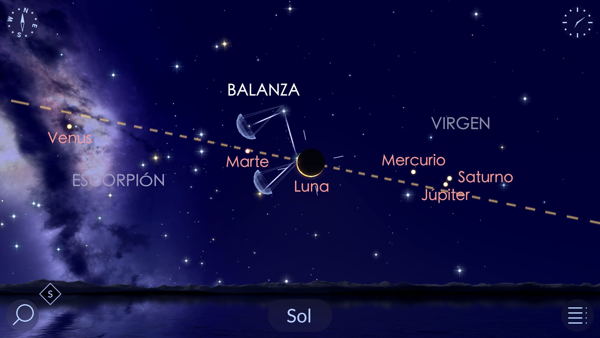 - Paso 3: Mueve tu dispositivo a lo largo de esta línea, y verás varios puntos grandes a los lados de la eclíptica, estos son los planetas.