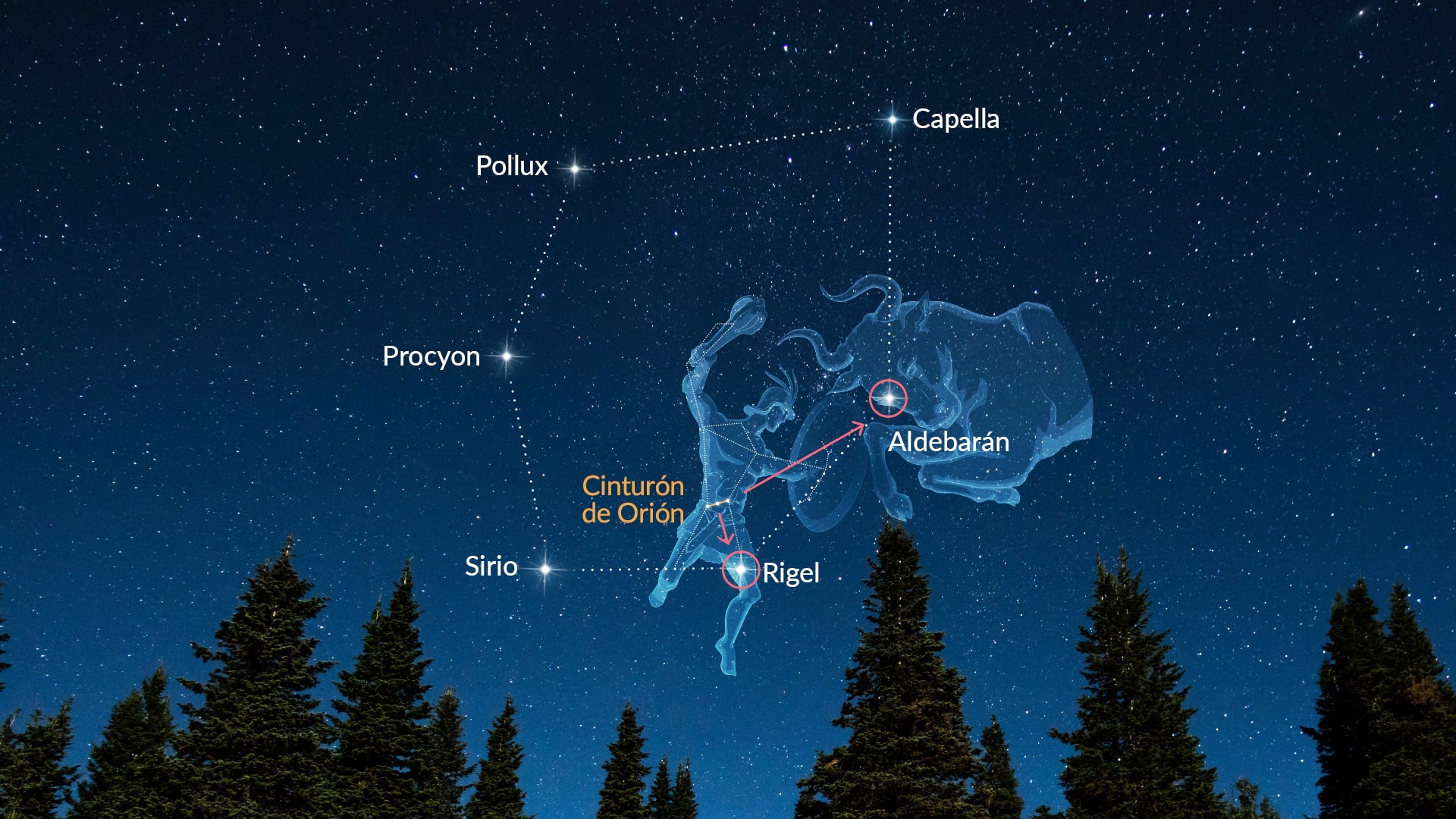 - Encuentra Aldebarán: traza una línea a través de las estrellas del Cinturón de Orión y estírala hacia el norte para encontrar Aldebarán en Tauro.