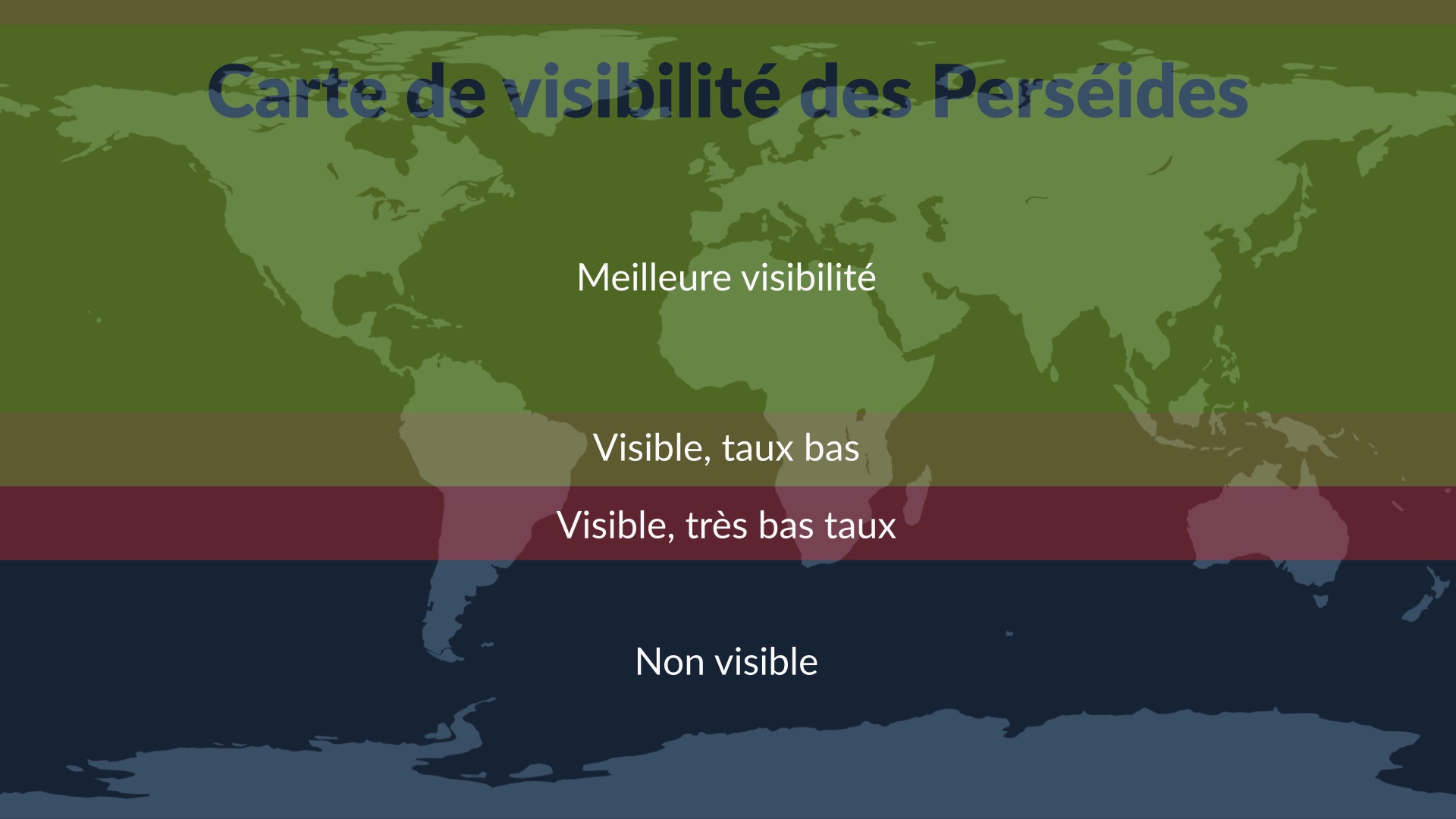 Les Perséides sont mieux observées aux latitudes moyennes nord. Là, le radiant de la pluie de météores s'élève haut dans le ciel vers 22h30, heure locale. Malheureusement, la pluie de météores des Perséides est difficilement observable depuis la majeure partie de l’hémisphère sud.