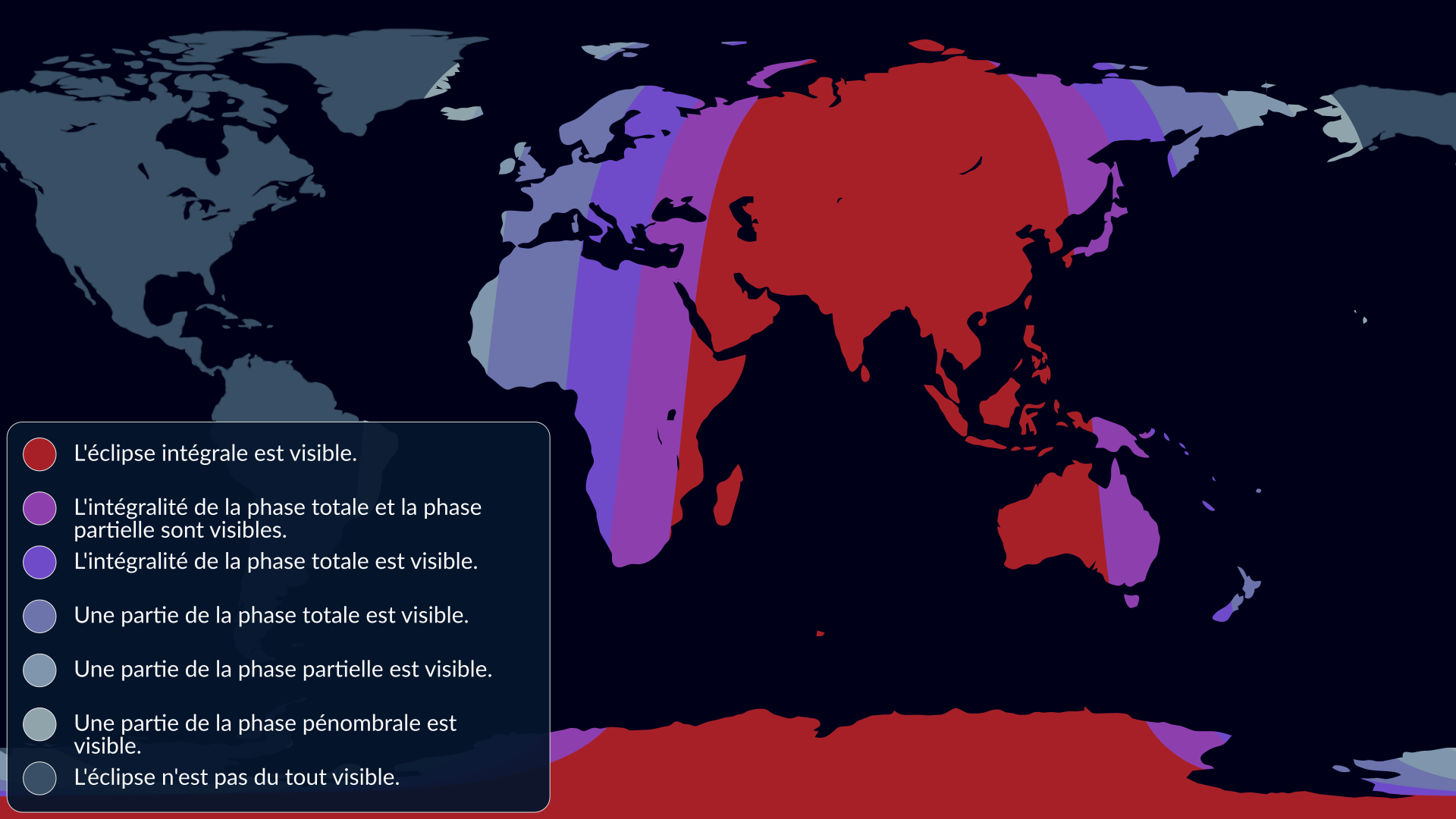 - L’éclipse entière sera visible depuis certaines zones d’Australie, d’Inde, d’Asie centrale, de Russie, du Japon et d’Afrique de l’Est.