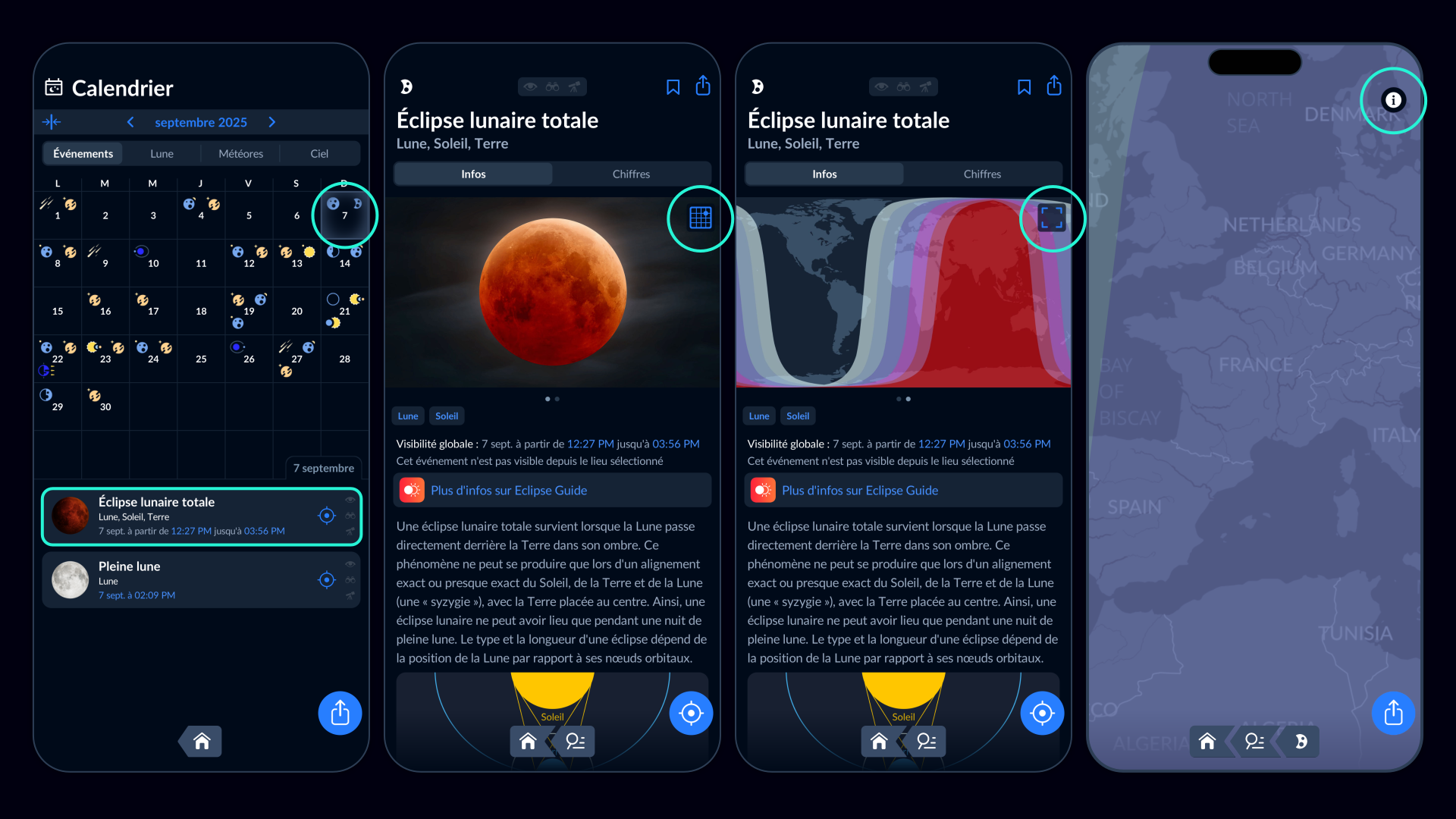 Parmi eux, l’application Eclipse Guide. Ses cartes interactives montrent l’éclipse dans son intégralité, avec l’orientation de la Lune ajustée à votre emplacement.