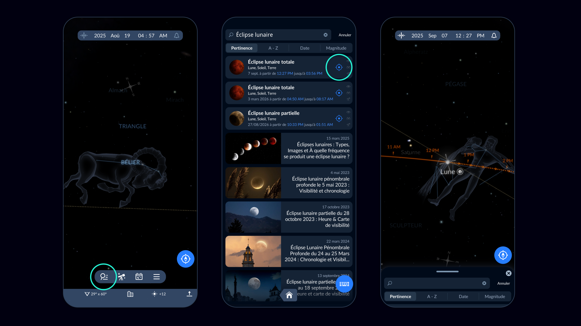 Inutile d’attendre cet instant précis pour l’apercevoir. Saturne sera proche de la Lune toute la nuit de l’éclipse, rendant le spectacle encore plus exceptionnel. Pour vérifier ce que vous observez, ouvrez l’app Sky Tonight et pointez votre appareil vers l’objet lumineux. L’application identifiera instantanément Saturne et les étoiles ou planètes voisines.