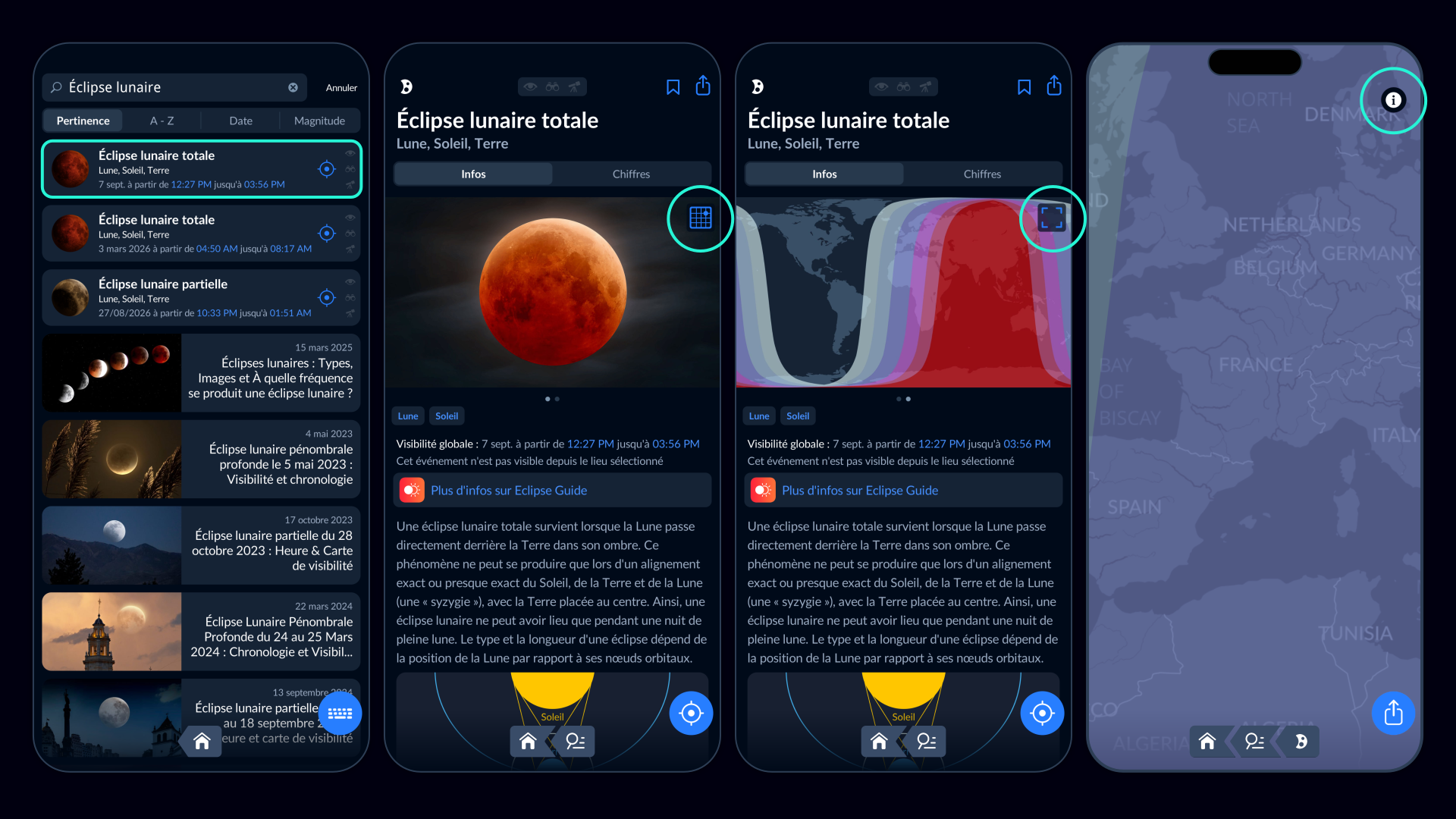 L’app indique aussi les horaires exacts dans votre fuseau horaire, recommande les meilleurs endroits pour observer et envoie des rappels pour ne rien manquer. Comme les éclipses ont lieu chaque année, Eclipse Guide peut aussi vous aider à planifier vos prochaines observations.