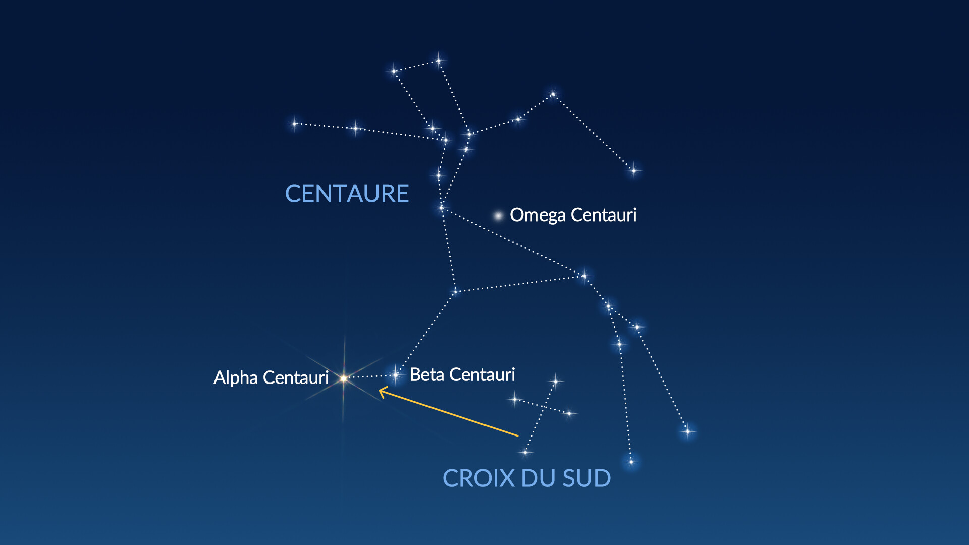 Pour trouver Centaurus dans le ciel, commencez par un repère facile : la Croix du Sud (Crux). Une fois repérée, regardez à proximité deux étoiles très brillantes — ce sont Alpha Centauri et Beta Centauri. Elles se voient facilement, même sous un ciel pollué par la lumière, et marquent la partie basse de la jambe du Centaure.