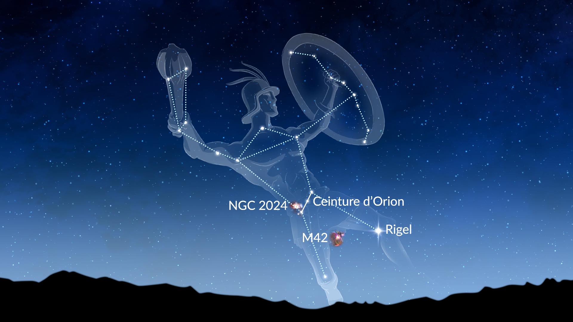 Orion est l'une des constellations les plus reconnaissables et les plus proéminentes du ciel, avec son astérisme distinctif de la Ceinture d'Orion qui le rend facile à localiser. En plus des trois étoiles formant la Ceinture (Alnitak, Alnilam et Mintaka), les observateurs à l'œil nu peuvent également repérer Rigel, Betelgeuse, Bellatrix et Saif - les étoiles les plus brillantes de la constellation qui marquent le corps d'Orion. La constellation contient également de nombreux objets curieux du ciel profond dans le Complexe Moléculaire d'Orion. La Nébuleuse d'Orion (M42) est assez brillante pour être observée à l'œil nu. La Nébuleuse de la Tête de Cheval (IC 434), la Nébuleuse de De Mairan (M43), la nébuleuse de réflexion M78, et la Nébuleuse de la Flamme (NGC 2024) peuvent être trouvées avec l'utilisation d'un télescope.