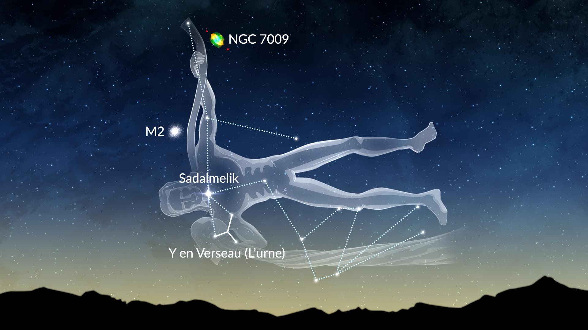 Le Verseau ne contient pas beaucoup d’étoiles brillantes. Les plus remarquables sont Sadalmelik et Sadalsuud. Sous un ciel sombre, vous pouvez repérer un astérisme en forme de « Y » appelé la Jarre d’eau. Les amateurs de ciel profond équipés d’instruments optiques peuvent y trouver les objets Messier M2 et M72 (amas globulaires) et M73 (un astérisme), ainsi que la Nébuleuse de l’Hélice (NGC 7293) et la Nébuleuse Saturne (NGC 7009).