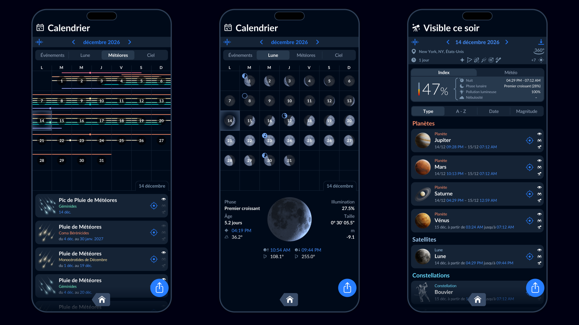 Toutes ces informations sont disponibles dans l'application gratuite Sky Tonight. Explorez la section Visible Ce Soir (l'icône de télescope sur l'écran principal) pour trouver la phase de la lune, les prévisions météorologiques et l'indice d'observation des étoiles pour chaque jour. Et découvrez quelles pluies de météores sont visibles pour votre emplacement dans l'onglet Pluies de Météores du calendrier de l'application (l'icône de calendrier sur l'écran principal).