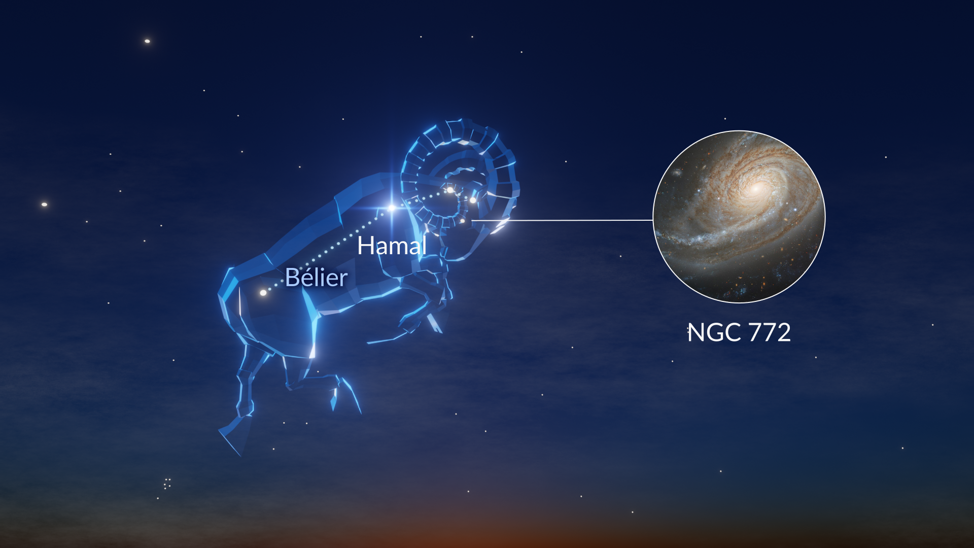 Le Bélier n’est pas une constellation particulièrement spectaculaire. C’est la 11ᵉ plus petite des 12 constellations du zodiaque, et ses étoiles ne sont que modérément brillantes. Comme elle n’est pas très marquée, vous aurez besoin d’un ciel sombre et sans Lune pour la repérer facilement. Dans de bonnes conditions d’observation, les trois étoiles qui forment la « tête » du Bélier — Hamal, Sheratan et Mesartim — ressortent nettement, comme si l’on avait augmenté leur luminosité. Avec un petit télescope, vous pouvez aussi voir que Mesartim est une étoile double.