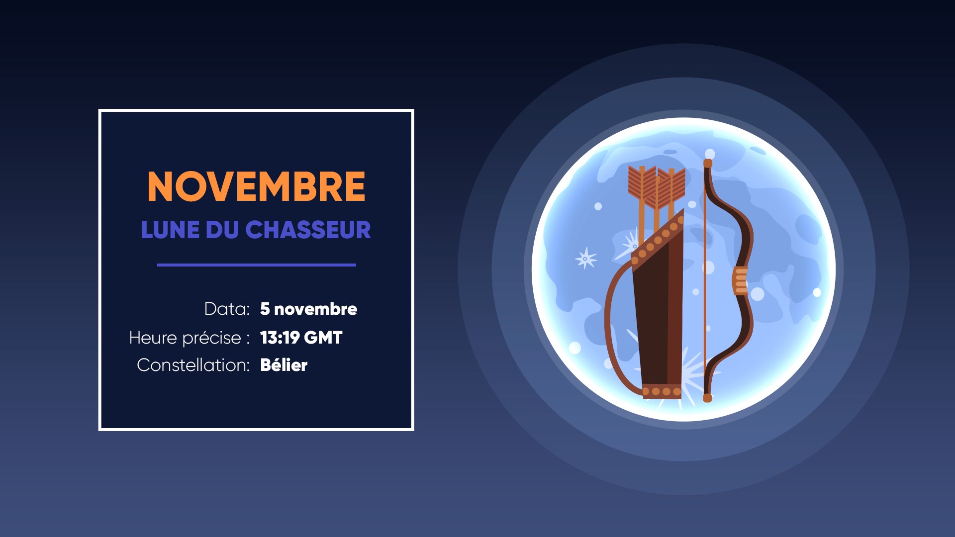 La Lune des Chasseurs est la Pleine Lune qui suit la Lune des Moissons. Cette année, elle se produit en novembre. Un nom plus commun pour la Pleine Lune de novembre est Lune du Castor, car ce mois était le moment de chasser les castors.