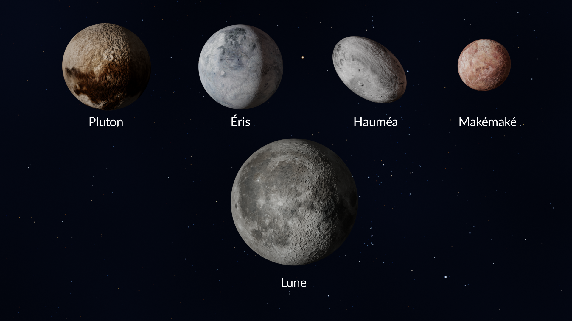 Les quatre planètes naines, plus Gongong et Quaoar ont des lunes en orbite autour d’elles. Haumea a même un anneau ! La ceinture de Kuiper contient également de nombreuses binaires, c’est-à-dire deux corps qui orbitent autour d’un centre de masse commun. L’exemple le plus remarquable de KBO binaire est la binaire Pluton-Charon.