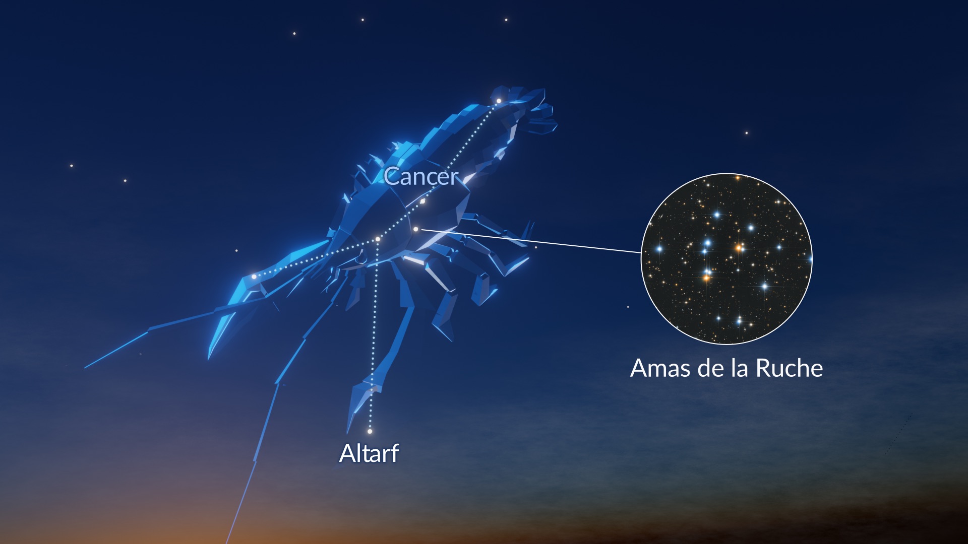 Pour localiser le Cancer dans l’hémisphère Nord, repérez d’abord les brillantes Pollux et Castor dans les Gémeaux et Régulus dans le Lion. Le Cancer se situe entre les deux, au-dessus de l’horizon sud — cherchez une faible figure en forme de Y autour de l’Amas de la Crèche.
