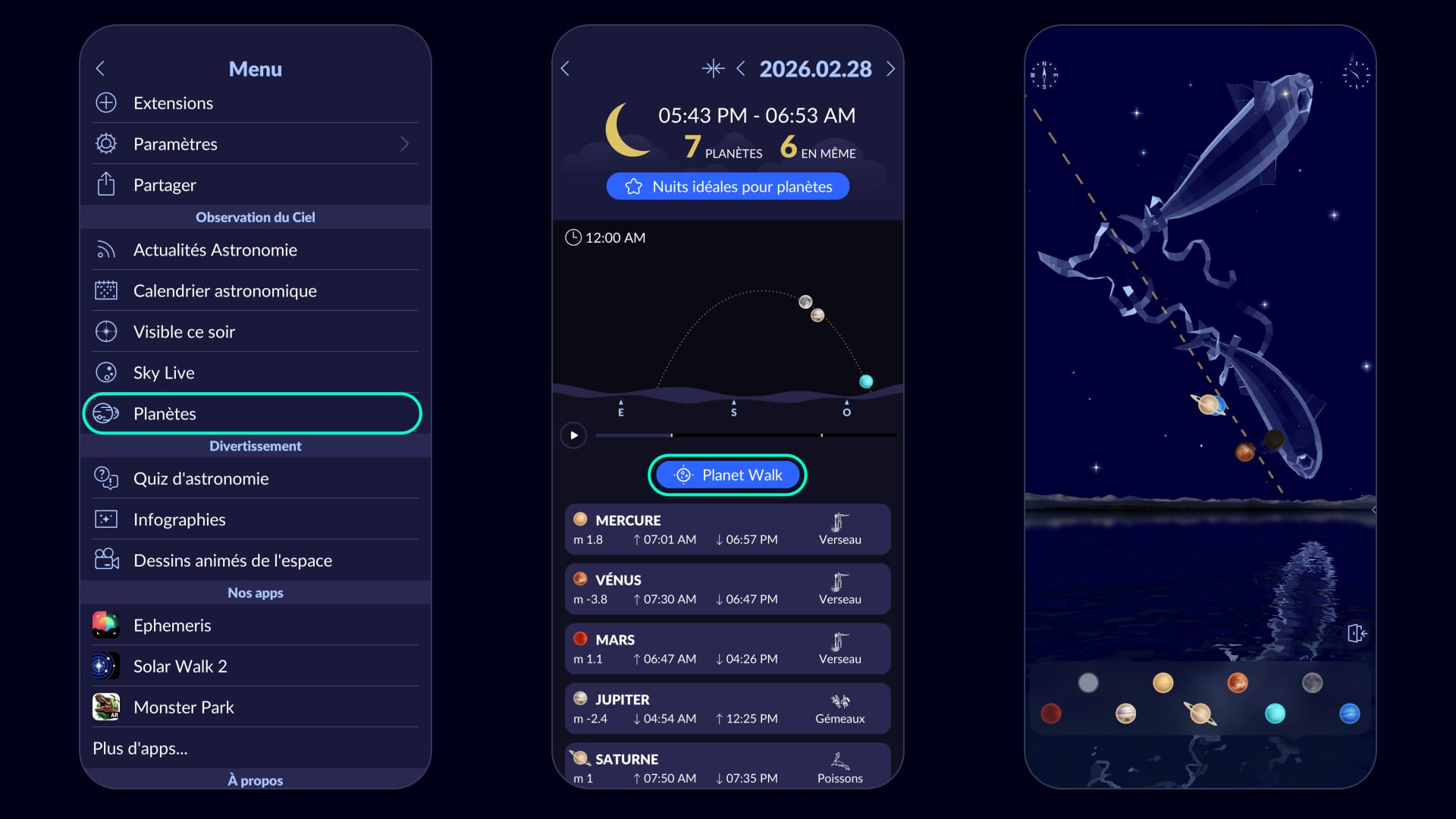 Vous voulez un guidage en temps réel pour votre position exacte ? Téléchargez l’application gratuite Star Walk 2 et utilisez la fonctionnalité Planet Walk pour vous guider de planète en planète.