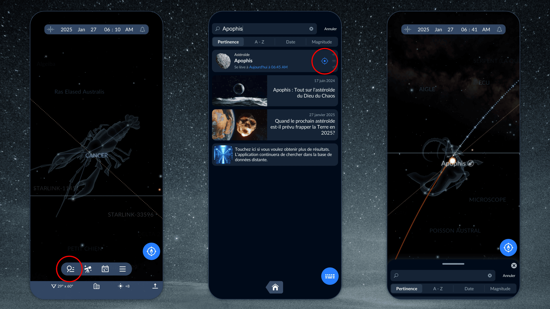 Vous pouvez suivre la position d’un astéroïde dans le ciel avec l’application Sky Tonight. Touchez l’icône en forme de loupe et saisissez son nom dans la barre de recherche. Lorsque l’astéroïde apparaît dans les résultats, touchez l’icône de cible bleue à côté de son nom. Sky Tonight vous montrera la position actuelle de l’astéroïde dans le ciel.