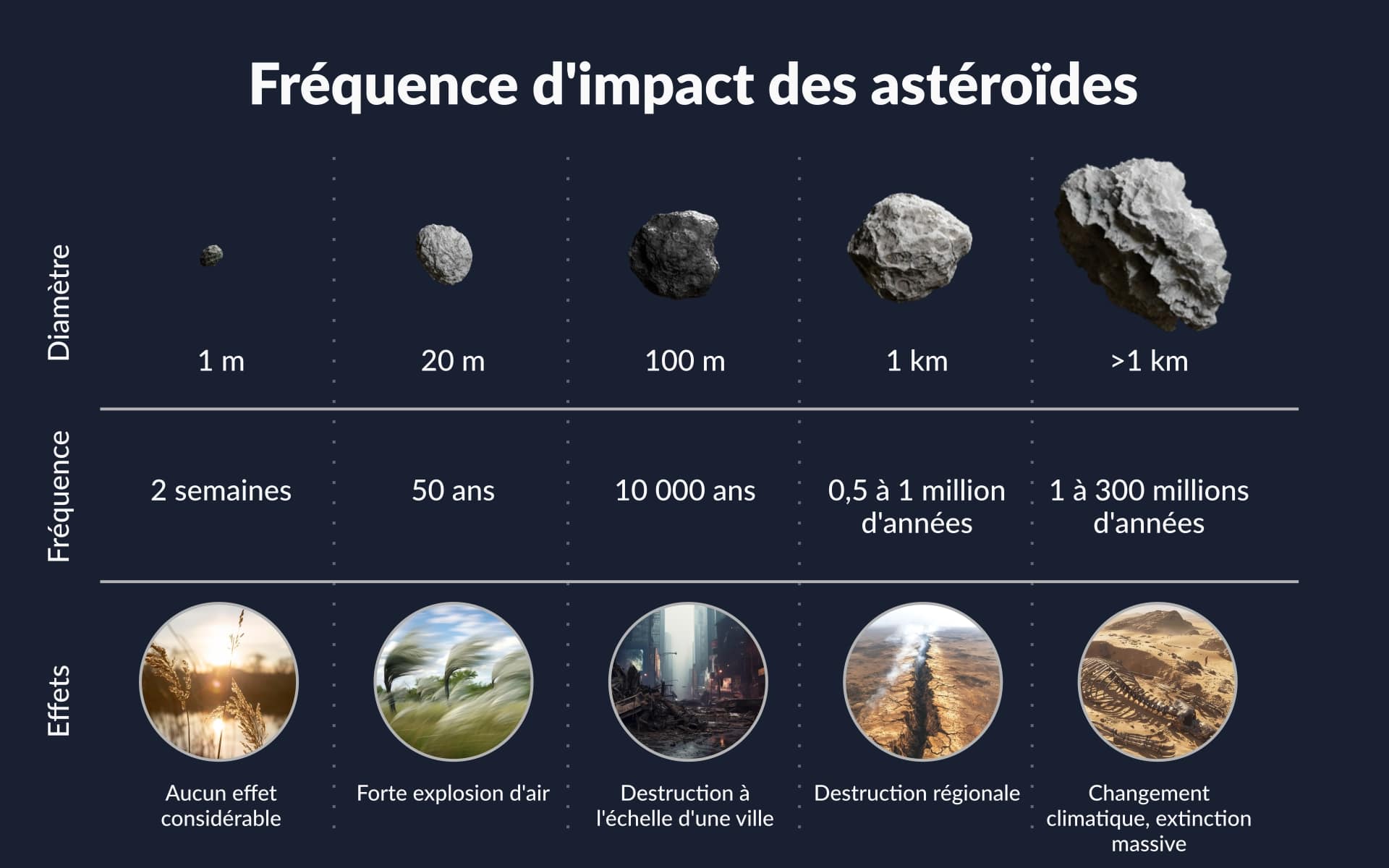Vous pouvez vous faire votre propre idée. Même des roches spatiales relativement petites, comme le bolide de Tcheliabinsk, peuvent causer des dégâts locaux. Les astéroïdes de plus d’1 kilomètre peuvent avoir des effets mondiaux, comme un changement climatique durable. Pour mieux visualiser cela, consultez notre infographie, dans laquelle nous comparons la taille des astéroïdes avec les conséquences possibles d’un impact.
