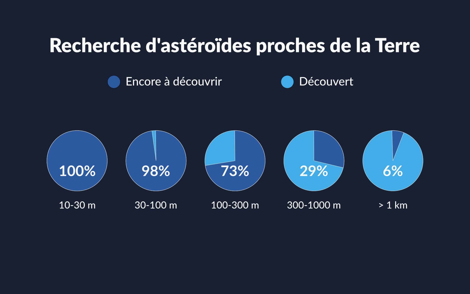 Au cours des dix dernières années, les relevés au sol et le télescope spatial de la NASA ont détecté des milliers d’objets géocroiseurs et ont grandement contribué à nos connaissances sur le suivi des astéroïdes et des comètes. D’après des données récentes, plus de 90 % des astéroïdes géocroiseurs de plus d’1 km de diamètre (assez grands pour avoir des conséquences mondiales) ont déjà été découverts. Cependant, environ la moitié des petits astéroïdes ne sont détectés qu’après être déjà passés près de la Terre. Il arrive que les astronomes ne remarquent un astéroïde que quelques heures avant son approche de la Terre, comme ce fut le cas avec l’astéroïde 2024 XA1, qui s’est embrasé au-dessus de la Sibérie en décembre 2024. Pour l’instant, c’est le mieux que nous puissions faire.