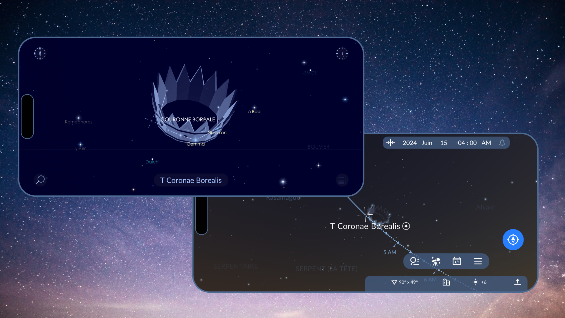 Pour repérer facilement l’emplacement de la future nova, utilisez nos apps Star Walk 2 ou Sky Tonight. Recherchez simplement T Coronae Borealis, pointez votre appareil vers le ciel et suivez la flèche jusqu’à ce que vous la voyiez sur la carte du ciel de l’app. Pour l’instant, vous ne verrez que l’obscurité à cet endroit, mais quel spectacle ce sera d’assister à l’apparition d’une « nouvelle » étoile brillante lorsque la nova entrera en éruption ! Pour rendre l’expérience encore plus immersive, familiarisez-vous à l’avance avec la constellation de la Couronne boréale.