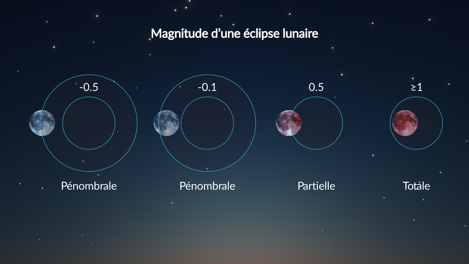 La magnitude indique jusqu’où la Lune s’enfonce dans l’ombre centrale sombre de la Terre (l’umbra) au moment du maximum de l’éclipse.