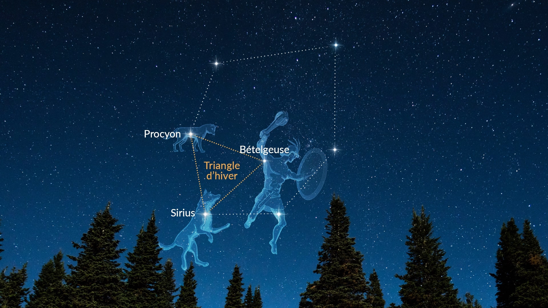 Si vous prenez Sirius et Procyon (qui forment le côté inférieur gauche de l'Hexagone d'Hiver) et les reliez à Bételgeuse (qui se trouve près du centre de l'astérisme en forme de cercle), vous obtiendrez le motif d'étoiles connu sous le nom de Triangle d'Hiver, ou le Grand Triangle du Sud. Vous avez peut-être aussi entendu parler de son homologue d'été, qui est visible toute l'année, malgré le nom.