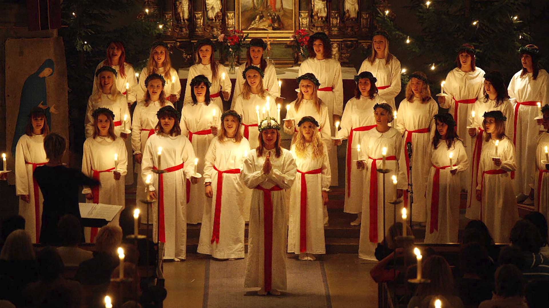 La fête de la Sainte-Lucie (comme son nom l'indique) est une célébration en l'honneur de Sainte-Lucie, une martyre chrétienne. Les filles s'habillent de robes blanches avec des ceintures rouges et portent des couronnes de bougies sur la tête en l'honneur de Sainte-Lucie.