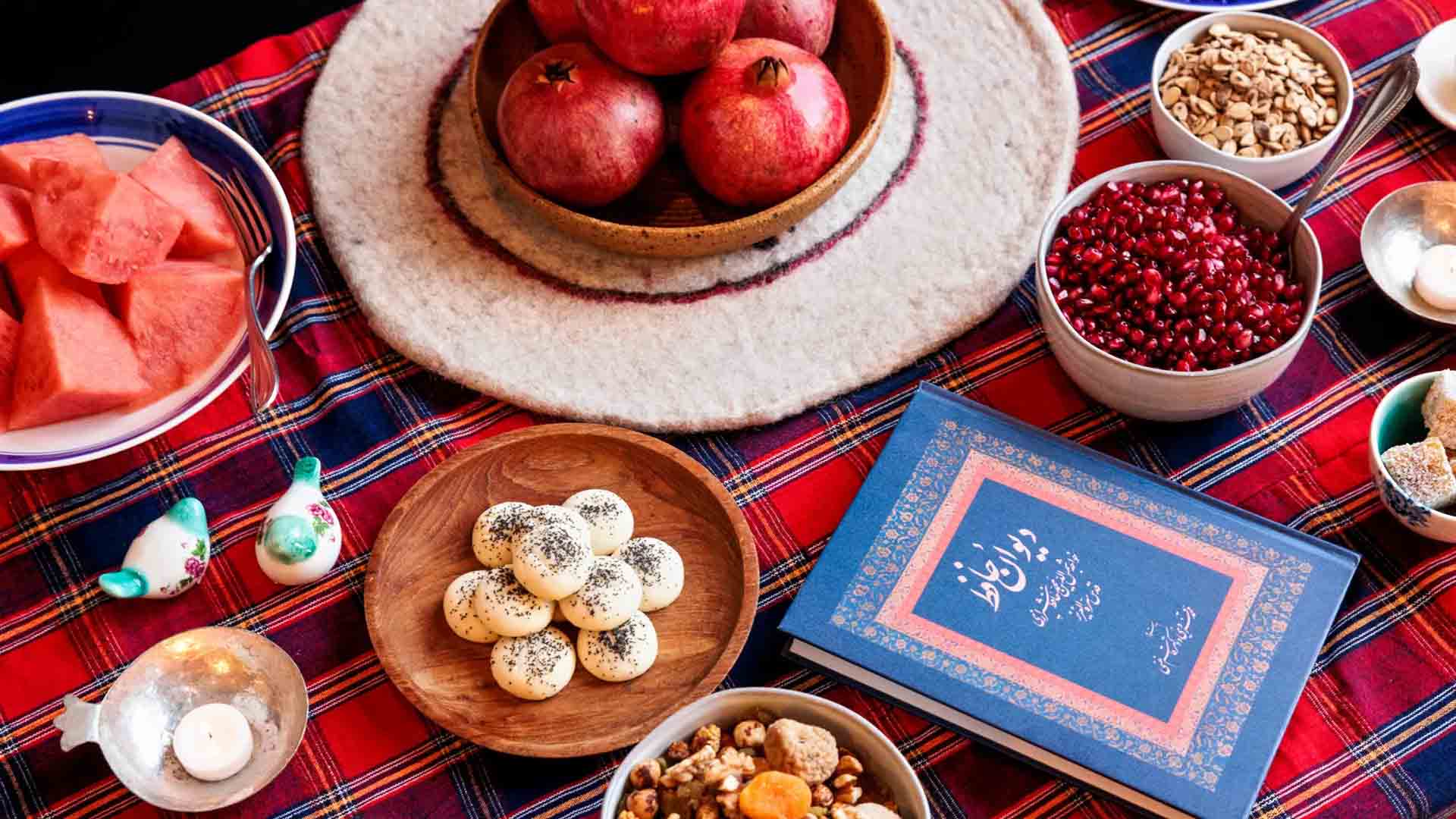 La nuit de Yalda est la fête que les familles et les amis célèbrent ensemble. Pendant la nuit la plus longue de l'année, ils mangent des aliments spéciaux comme des noix, des grenades et des pastèques, dont la couleur rouge symbolise les teintes pourpres de l'aube et la lueur de la vie. Certains restent éveillés toute la nuit pour accueillir le lever du soleil.