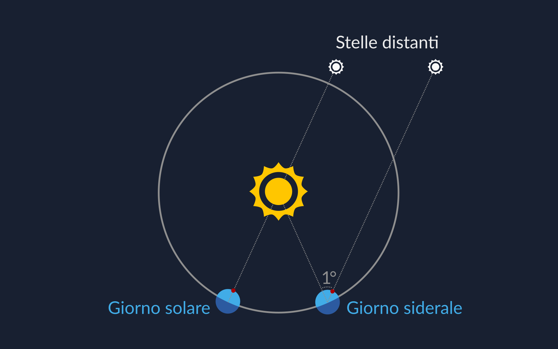 In due giorni consecutivi, il nostro pianeta deve ruotare un po' di più sul suo asse perché il Sole ritorni nello stesso posto. Durante un singolo giorno siderale, la Terra ruota di 360° e, per completare il giorno solare, deve ruotare di 1° in più (per un totale di 361°). E poiché la velocità dell'orbita terrestre cambia, cambia anche l'angolo supplementare che la Terra deve ruotare per riportare il Sole attraverso il meridiano.