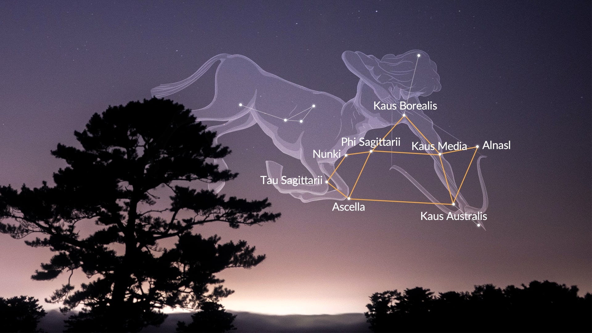 Assicurati di osservare il famoso asterismo della Teiera in Sagittario. Le stelle Kaus Media, Kaus Australis, Ascella e Phi Sagittarii formano il corpo della teiera, mentre Kaus Borealis segna il coperchio. La punta del beccuccio è rappresentata da Alnasl, e l'impugnatura è formata da Nunki e Tau Sagittarii. Sotto un cielo scuro, potresti anche vedere il "vapore" della Via Lattea che sale dal beccuccio. Questo asterismo è visibile da entrambi gli emisferi.