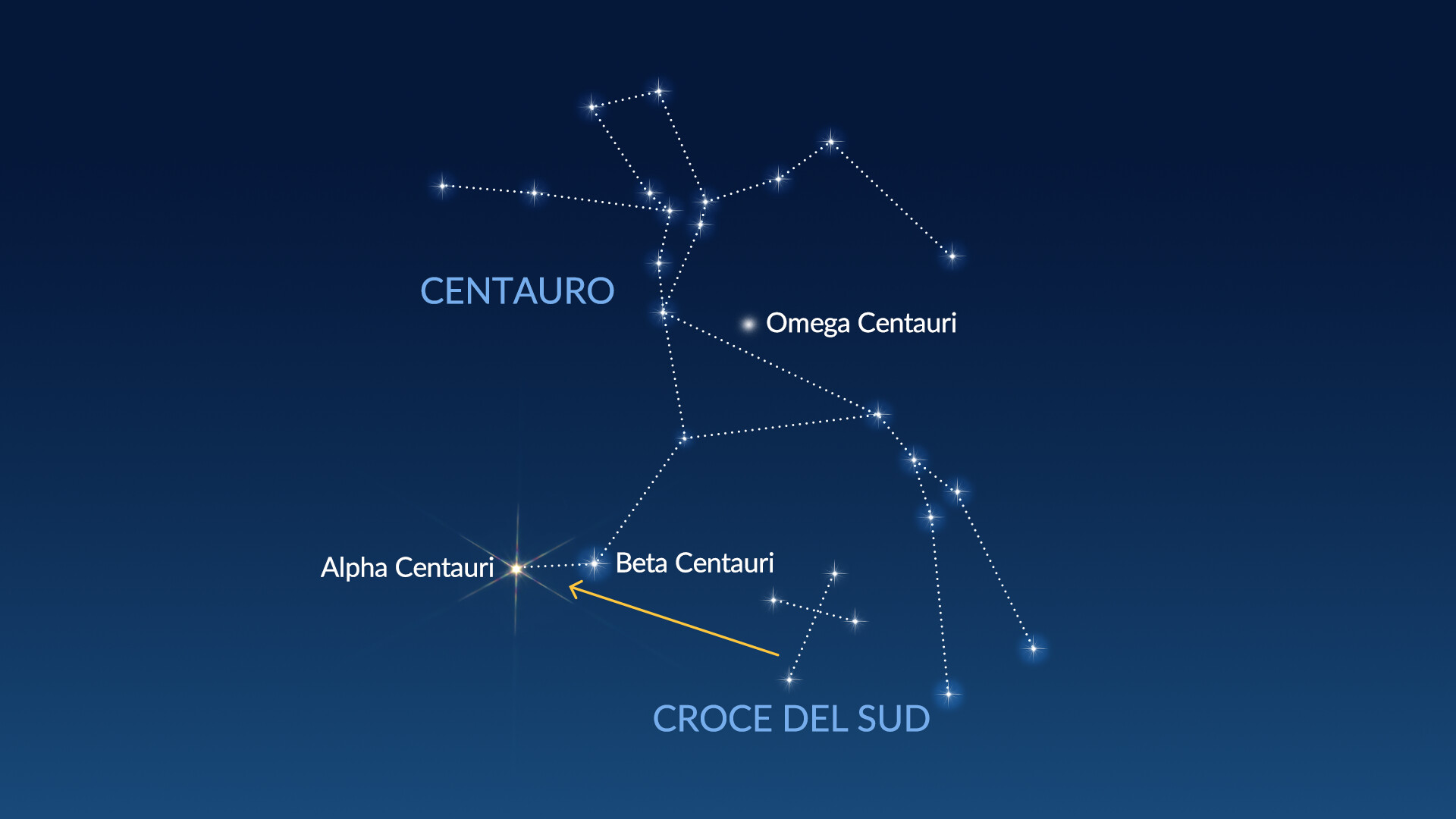 Da qui diventa un po’ più difficile, ma sotto un cielo buio puoi riconoscere il corpo del Centauro come un triangolo di stelle sopra la Croce del Sud e le due stelle “puntatrici” (Alpha e Beta Centauri). Se non sei sicuro di avere il triangolo giusto, c’è un indizio molto utile: sul dorso del Centauro c’è una “stella” evidente che in realtà è un ammasso stellare — Omega Centauri.