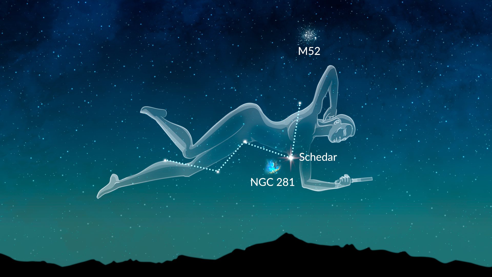 Nell'articolo sulle costellazioni dell'Emisfero Nord, abbiamo già trattato la costellazione di Cassiopea, nota per il suo asterismo a forma di W. La stella più prominente nella costellazione è Schedar. Gli oggetti del cielo profondo notevoli all'interno della costellazione includono ammassi stellari (M52, M103, NGC 457, NGC 663), diverse galassie (NGC 147, NGC 185, NGC 278) e la Nebulosa Pacman (NGC 281) – una nuvola di gas spaziale denominata dopo il personaggio del gioco omonimo. L’asterismo a forma di “W” di Cassiopea è visibile sopra i 20ºS ed è circumpolare sopra i 45ºN.