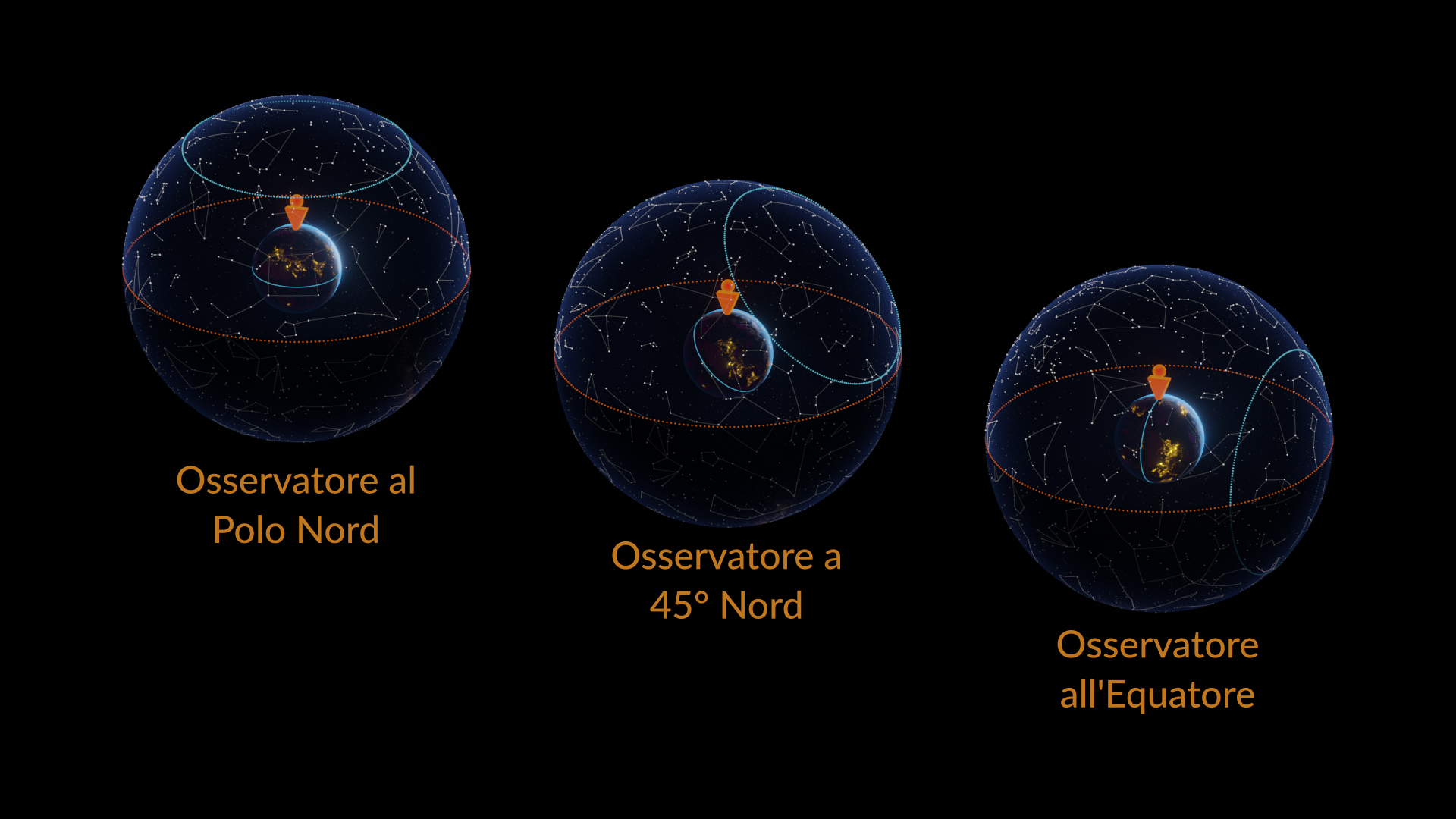 Ai poli Nord e Sud della Terra, il polo celeste corrispondente si trova direttamente sopra la testa e tutto il cielo settentrionale o meridionale resta sempre sopra l’orizzonte; le stelle si muovono in cerchi nel cielo senza mai sorgere né tramontare. Man mano che ci si avvicina all’equatore, i poli celesti si abbassano verso l’orizzonte e alcune costellazioni iniziano a sorgere e tramontare, mentre altre rimangono sempre visibili.