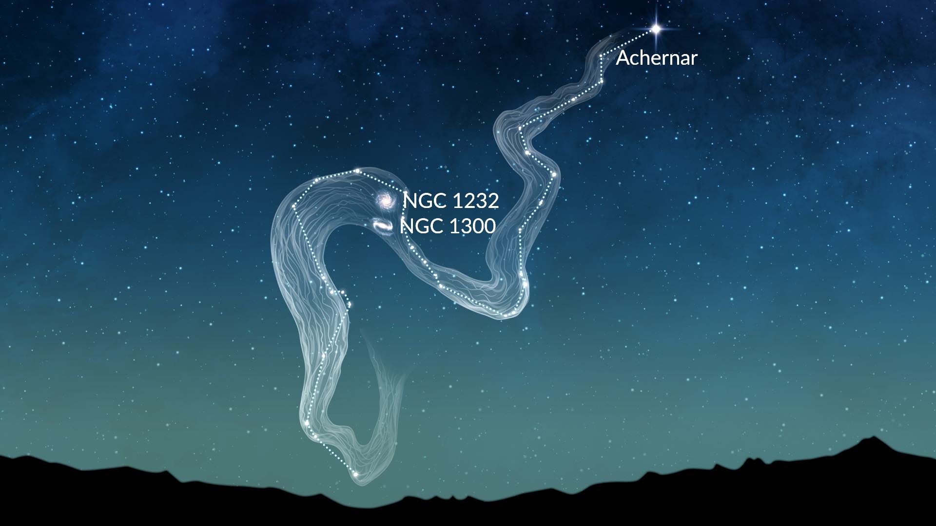L’Eridano è associato a diversi fiumi, reali e mitologici, in varie culture. È una delle costellazioni più lunghe e più deboli. La sua stella più brillante, Achernar, può essere trovata facilmente con l’aiuto della Croce del Sud. Il resto della costellazione è visibile solo nei luoghi più bui, lontano dalle città e dall’inquinamento luminoso. L’Eridano ospita un grande numero di galassie (per esempio il Gruppo di galassie dell’Eridano, NGC 1232, NGC 1300 e NGC 1309); è consigliabile portare un telescopio per osservarle.