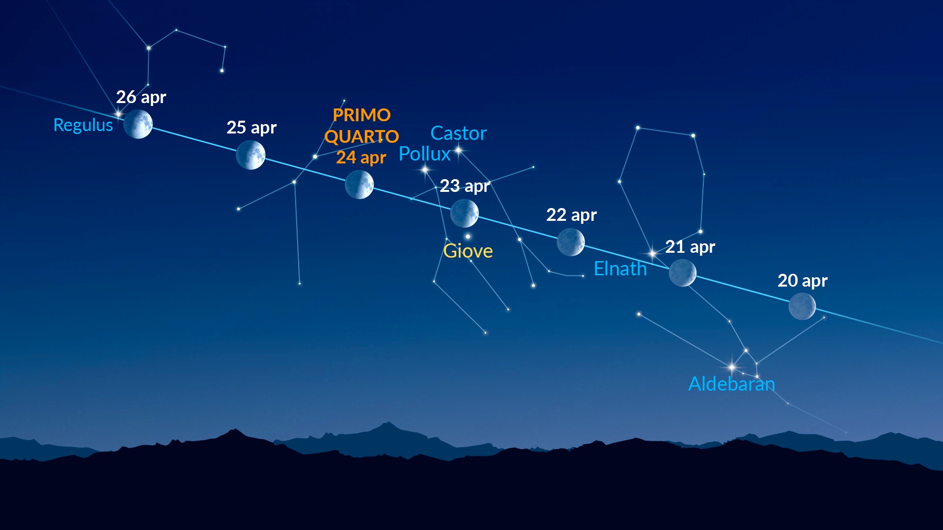 Le stelle più evidenti vicino al nostro satellite naturale saranno Aldebaran (mag 0.9) ed Elnath (mag 1.6) del Toro, Castore (mag 1.6) e Polluce (mag 1.1) dei Gemelli, e Regolo (mag 1.4) del Leone.