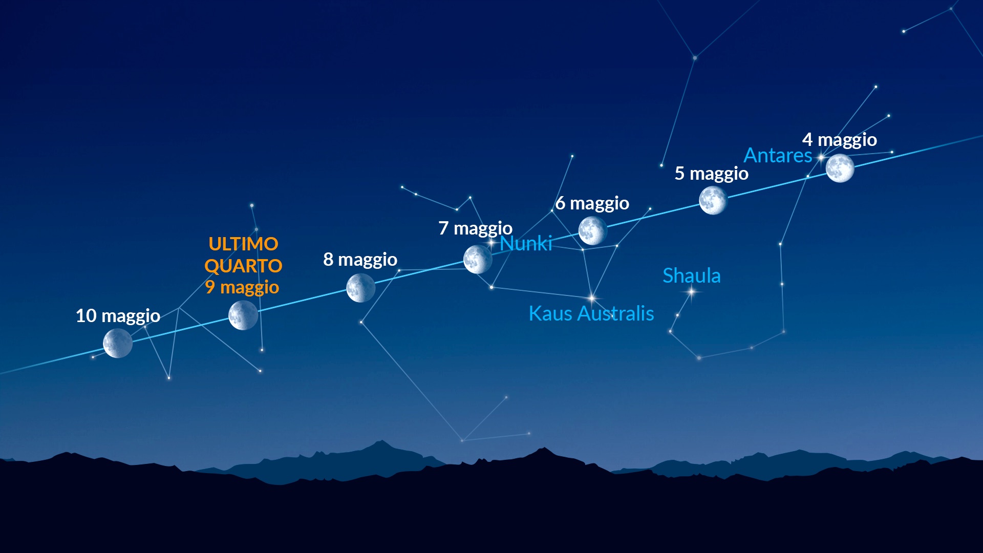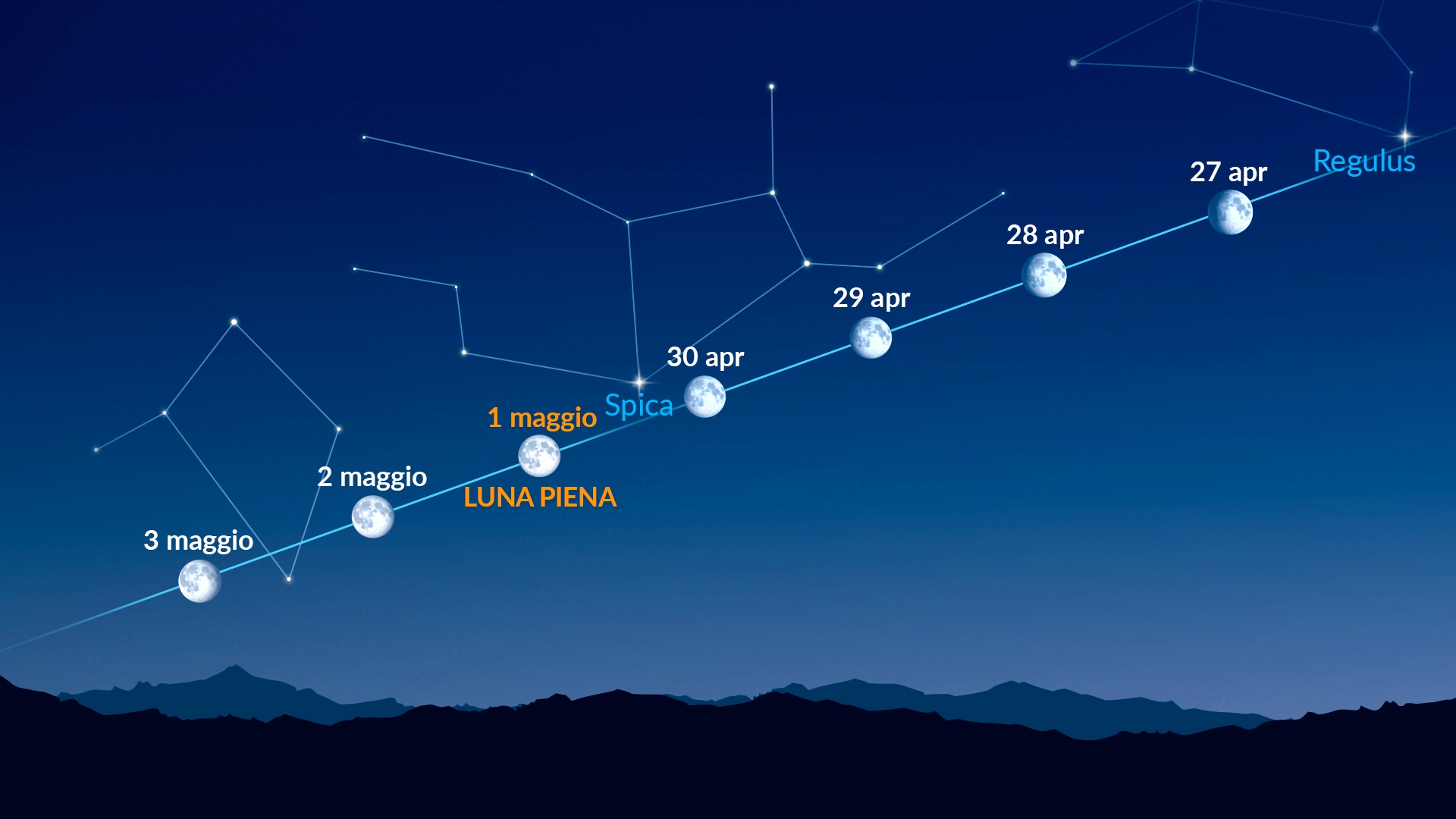 Dal 27 aprile al 3 maggio 2026, la Luna attraverserà le costellazioni del Leone, della Vergine e della Bilancia. Le stelle più evidenti vicino al nostro satellite naturale saranno Regolo (mag 1.4) del Leone e Spica (mag 1.0) della Vergine.