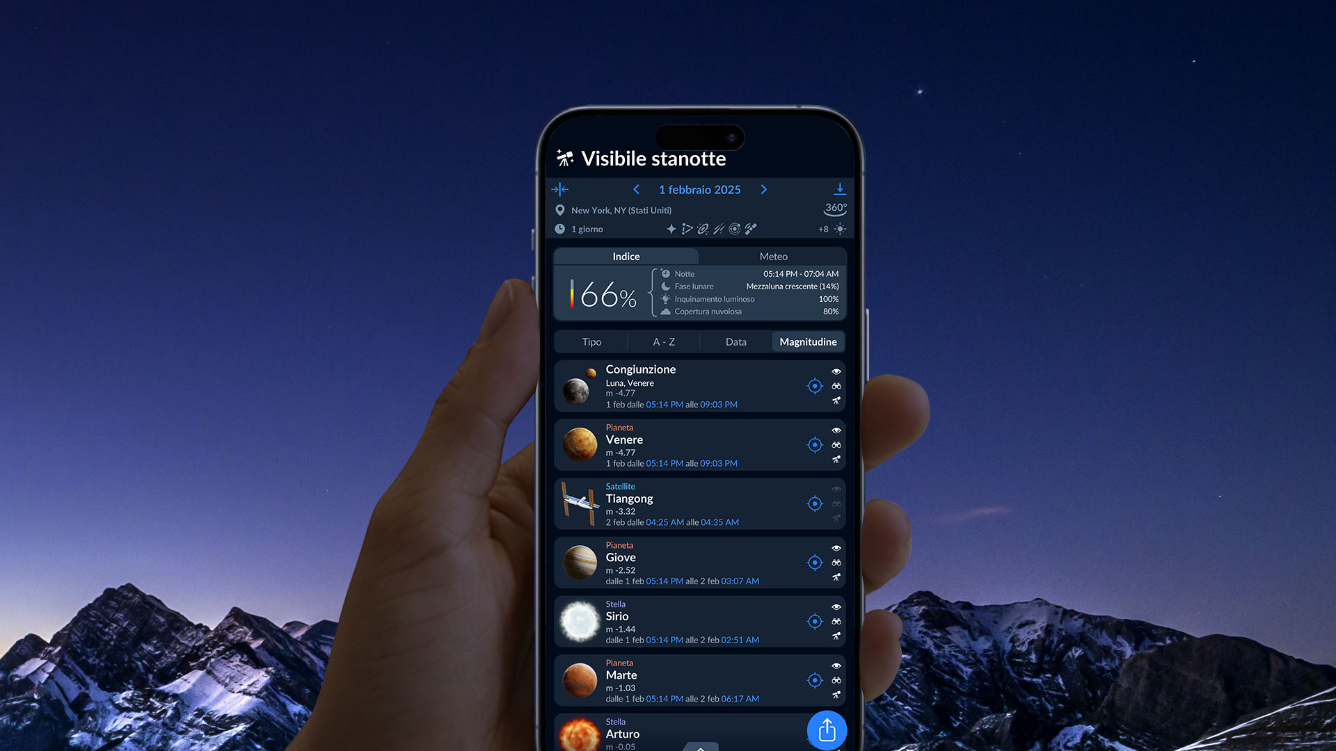 Vuoi sapere se gli eventi celesti di febbraio saranno visibili dalla tua posizione? Prova l’app Sky Tonight! Offre una vista in tempo reale di pianeti, stelle, costellazioni e persino oggetti di cielo profondo, tutto su misura per la tua posizione. Inoltre, elenca i prossimi eventi celesti con orari precisi per la tua zona. Che tu stia pianificando una serata di osservazione o voglia solo sapere cosa c’è lassù, Sky Tonight rende l’esplorazione del cielo notturno semplice ed entusiasmante. Provala e scopri cosa ti aspetta stasera!