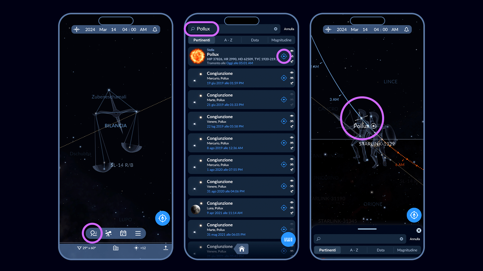 Un altro modo per individuare Polluce è utilizzare un’app di osservazione, come Sky Tonight. Con pochi tocchi potrai vedere la posizione della stella. Guarda l’immagine qui sotto o segui la video guida e scopri quanto è semplice!