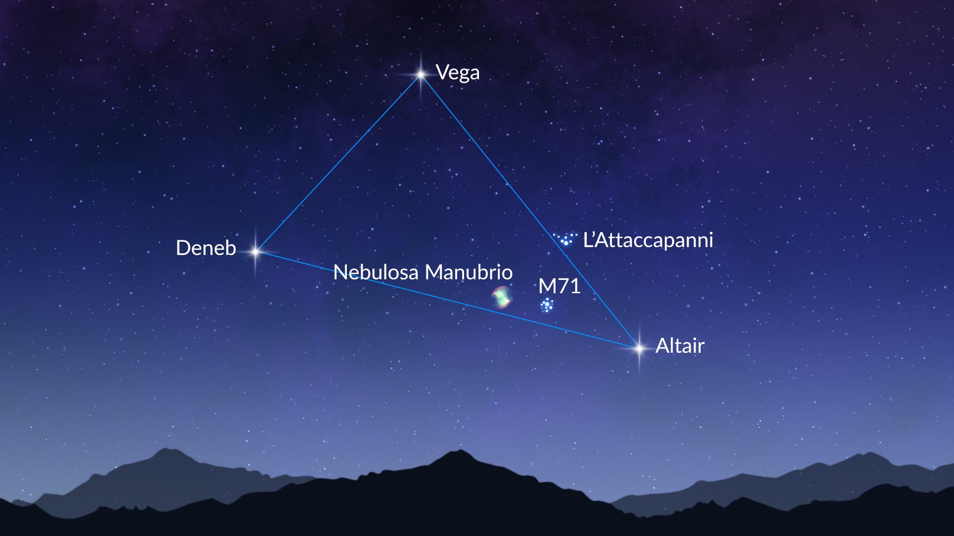 Una volta che avete padroneggiato il Triangolo Estivo, potete migliorare le vostre osservazioni e cercare oggetti più difficili all'interno. Usa i binocoli e guarda a metà strada fra Vega e Altair per individuare un piccolo gruppo di stelle chiamate l'Attaccapanni. Questo gruppo è formato da una barra composta da una linea di sei stelle, più un gancio composto da quattro stelle. È anche conosciuta con i nomi Brocchi’s Cluster, Al Sufi’s Cluster e Collinder 399.
