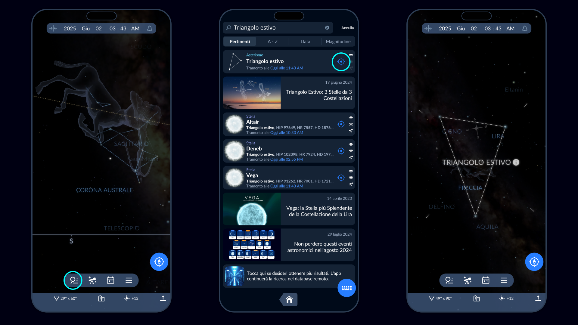 Ed ecco fatto! Collega questi tre punti e otterrai il Triangolo Estivo. Per controllare se lo hai identificato correttamente, apri l'app Sky Tonight e vai alla finestra di ricerca. Inizia a digitare "Triangolo Estivo" nella barra di ricerca, e quando appare il risultato corrispondente, tocca l'icona blu del bersaglio accanto ad esso. L'app ti mostrerà la posizione del Triangolo Estivo nel tuo cielo. Punta il dispositivo verso il cielo: l'app mostrerà una mappa stellare dal vivo e seguirà i tuoi movimenti.
