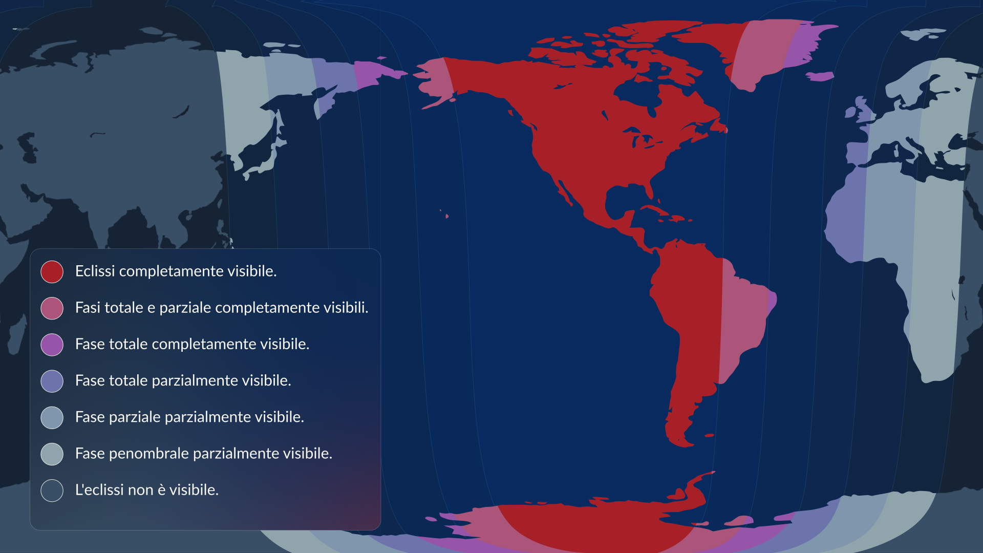 - Almeno parte dell’eclissi sarà visibile dall’Europa, da gran parte dell’Asia, Australia e Africa, in tutto il Nord e Sud America, nel Pacifico, nell’Atlantico, nell’Artico e in Antartide.