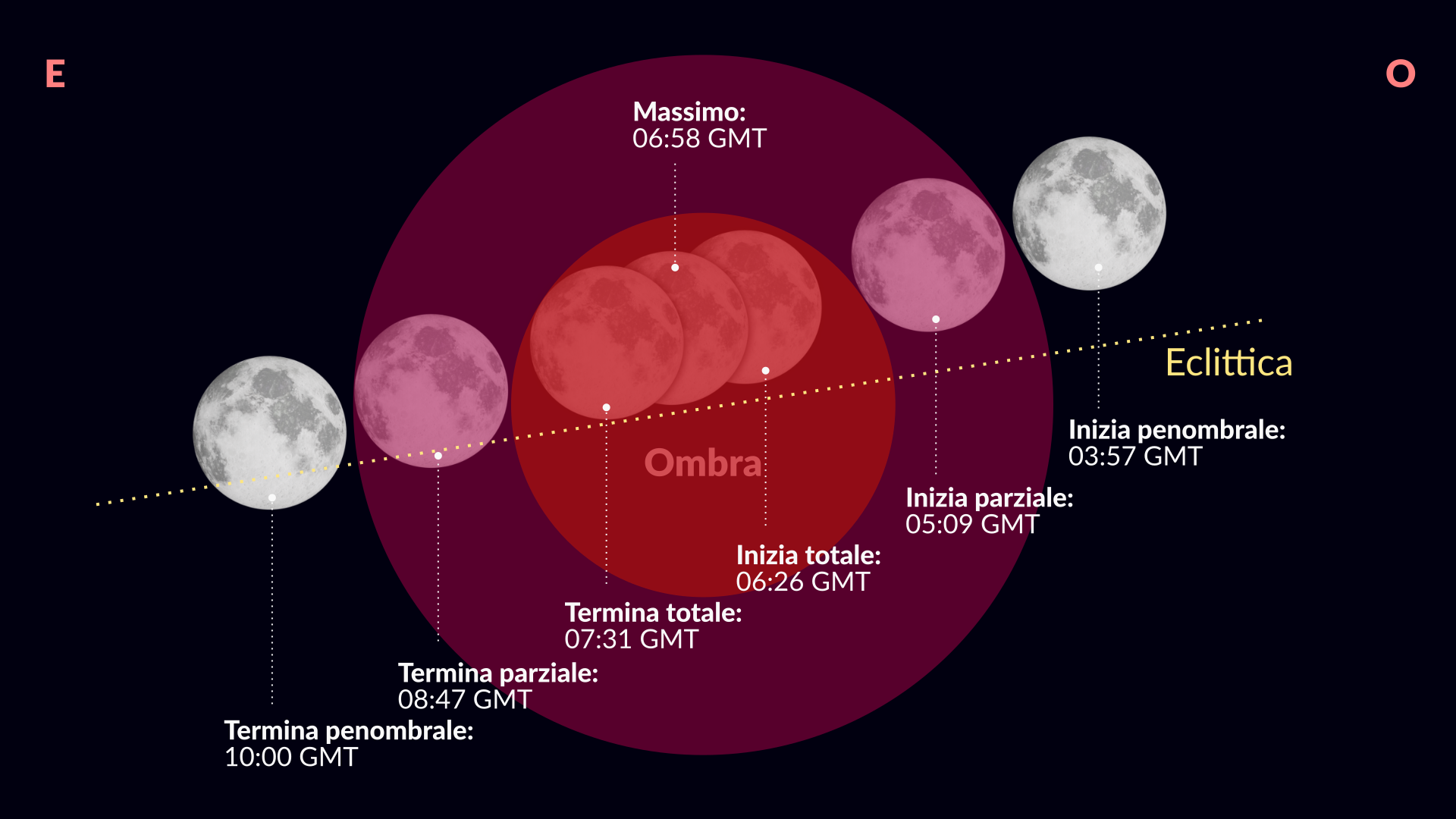 - Inizio dell’eclissi di penombra alle 03:57 GMT;
