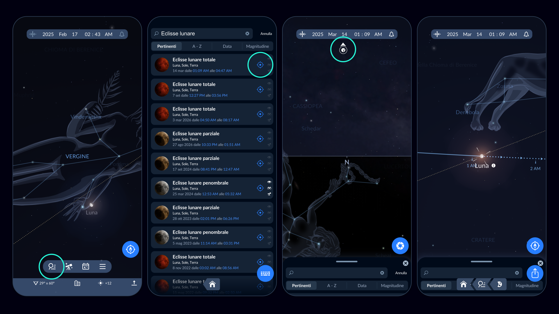 Per vedere dove sarà la Luna eclissata nella mappa del cielo, tocca il pulsante di puntamento. Per allineare l’immagine sul tuo telefono con il cielo reale, tocca il pulsante della bussola e poi segui la freccia bianca finché la Luna non appare sul tuo schermo. Prendi nota della sua posizione e pianifica in anticipo la tua notte di osservazione!
