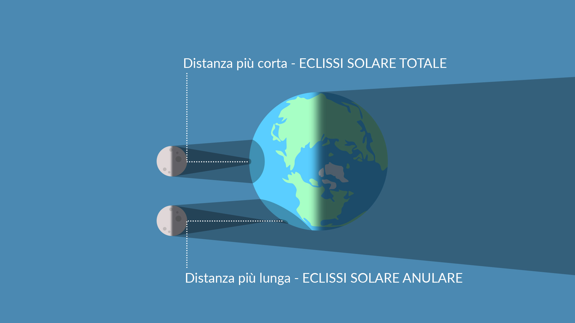Le eclissi solari si verificano quando la Luna passa tra il Sole e la Terra, bloccando la luce solare parzialmente o completamente. A seconda della posizione della Luna e del punto di osservazione, è visibile uno dei tre tipi di eclissi — parziale, totale o anulare. Raramente si verifica un’eclissi ibrida: in alcune località si osserva un’eclissi totale, mentre in altre si vede un’eclissi anulare.