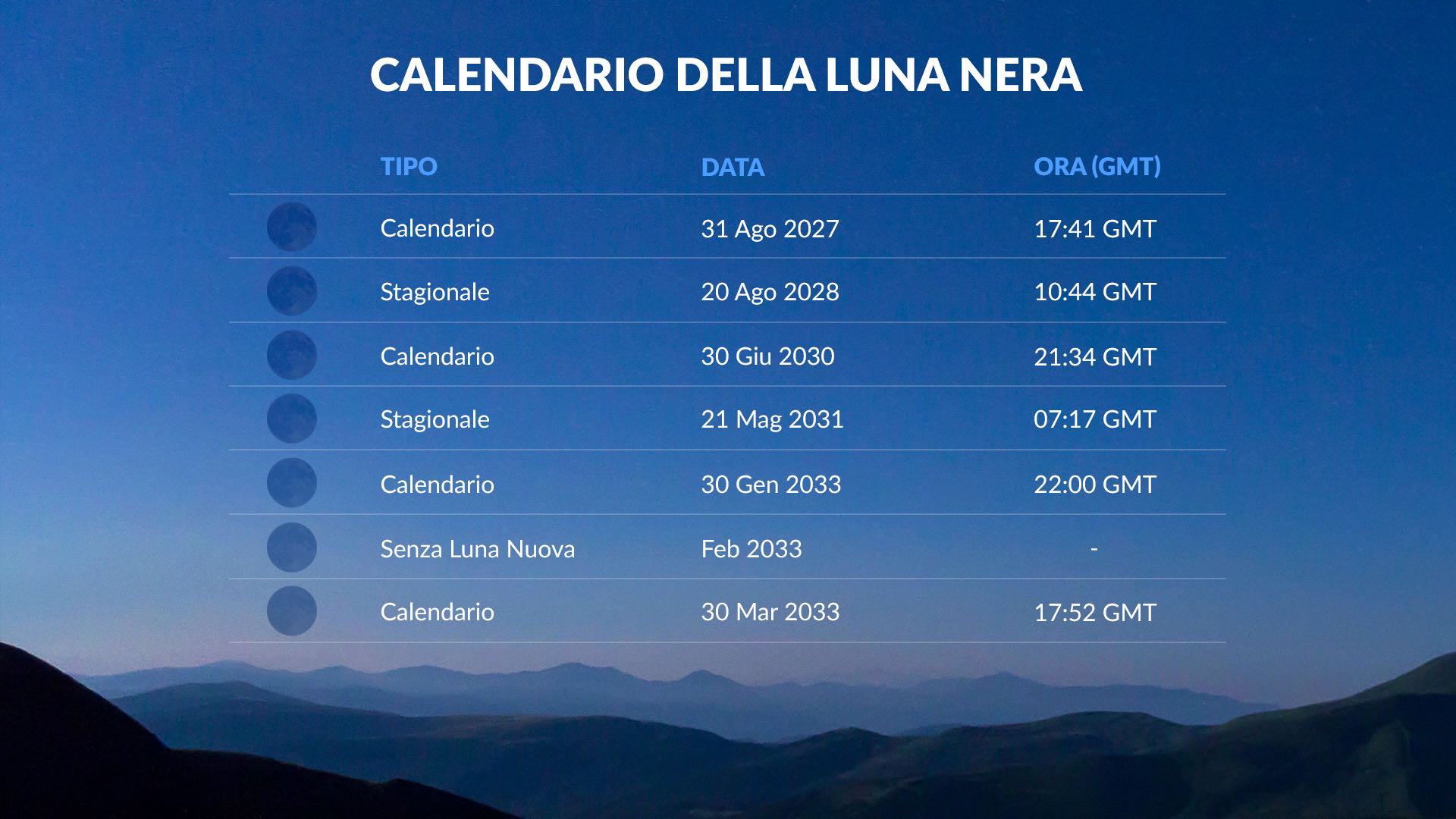 - 31 agosto 2027 — la prossima Luna Nera secondo la definizione di calendario più comune, perché sarà la seconda Luna Nuova in uno stesso mese di calendario;