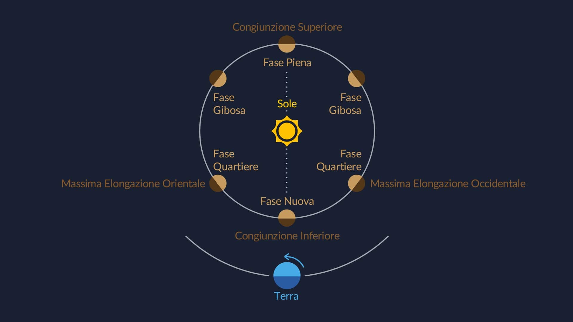 Come mostra l’immagine sopra, i pianeti inferiori attraversano un ciclo completo di fasi: dalla fase nuova alla congiunzione inferiore, alle fasi di quarto vicino alle massime elongazioni, fino alla fase piena alla congiunzione superiore. Tuttavia, osservare le fasi piena e nuova è estremamente difficile, perché in queste fasi i pianeti si perdono nel bagliore del Sole. Perciò, le fasi visibili vanno dalla falce alla fase gibbosa.