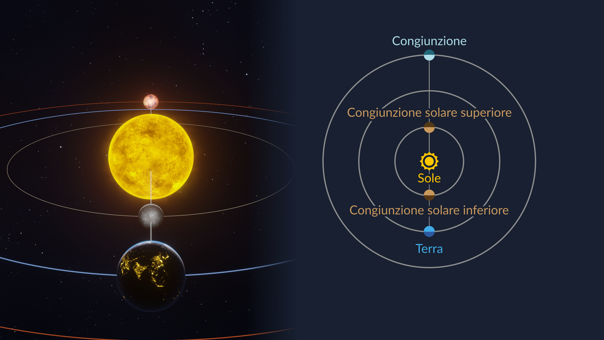 ¹In rari casi, un pianeta interno può comunque essere osservato in congiunzione durante un transito, quando attraversa il disco del Sole come un piccolo punto nero. Il prossimo transito di Mercurio sarà il 13 novembre 2032, e il prossimo transito di Venere sarà l’11 dicembre 2117.